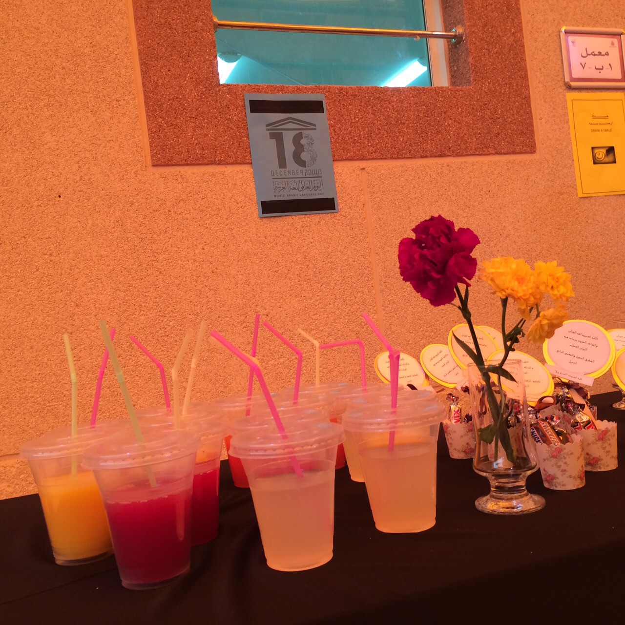 نظمت مجموعة من طالبات كلية الصيدلة برنامجًا بمناسبة اليوم العالمي للغة العربية والذي يوافق الخميس 26\2\1436هـ وقد تمثل في إقامة ركن مميز اشتمل على مطويات ومنشورات عن اللغة العربية وفنونها بأشكال جميلة، وقمن الطالبات المشاركات بتثقيف الحاضرات عن أهمية اللغة العربية كلغة للقرآن الكريم وكإحدى اللغات العالمية ذات السيادة وهي أيضًا هوية مميزة لنا وقد عُرض شيء من كنوزها ودررها مثل بعض المصطلحات والأمثال والأشعار،ويذكرأن هذه الفعالية قام بإعدادها وتنظيمها الطالبات :ايلاف الدوسري-مرام ال ثابت-نجوى طيب – شروق الشقيفي- مجد الكلثم –عذبة القدان وبإشراف من المجلس الطلابي للكلية.