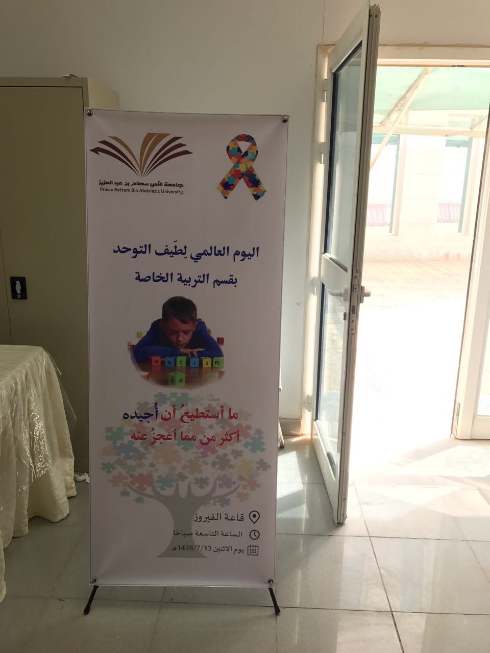 تحت إشراف وحدة العمل الطلابي بالتعاون مع قسم التربية الخاصة أقيم احتفالا باليوم العالمي لاضطراب طيف التوحد بحضور طالبات قسم التربية الخاصة والأقسام الأخرى وبالتعاون مع جمعية أسر التوحد الخيرية بالخرج ,وتضمن الاحتفال عدة فعاليات منها كلمة لوكيلة قسم التربية الخاصة د.فايزة احمد,وكلمة لجمعية أسر التوحد بالخرج والعديد من الفقرات التربوية التعليمية الهادفة والمتنوعة.وهدف الاحتفال إلى توعية مجتمع الكلية باضطراب طيف التوحدوتعريفه باليوم العالمي للتوحد وشعاره و التعريف بحقوق الأطفال ذوي اضطراب التوحد وأسباب اضطراب طيف التوحد وأبرز برامجه, هذا وتضمن الاحتفال مجموعة من الأركان التعليمية للطلبة ذوي اضطراب طيف التوحدواركان توعوية باضطراب طيف التوحد و ترفيهية للطلبة وركن تربوي تعليمي توعوي لجمعية أسر التوحد بالخرج,