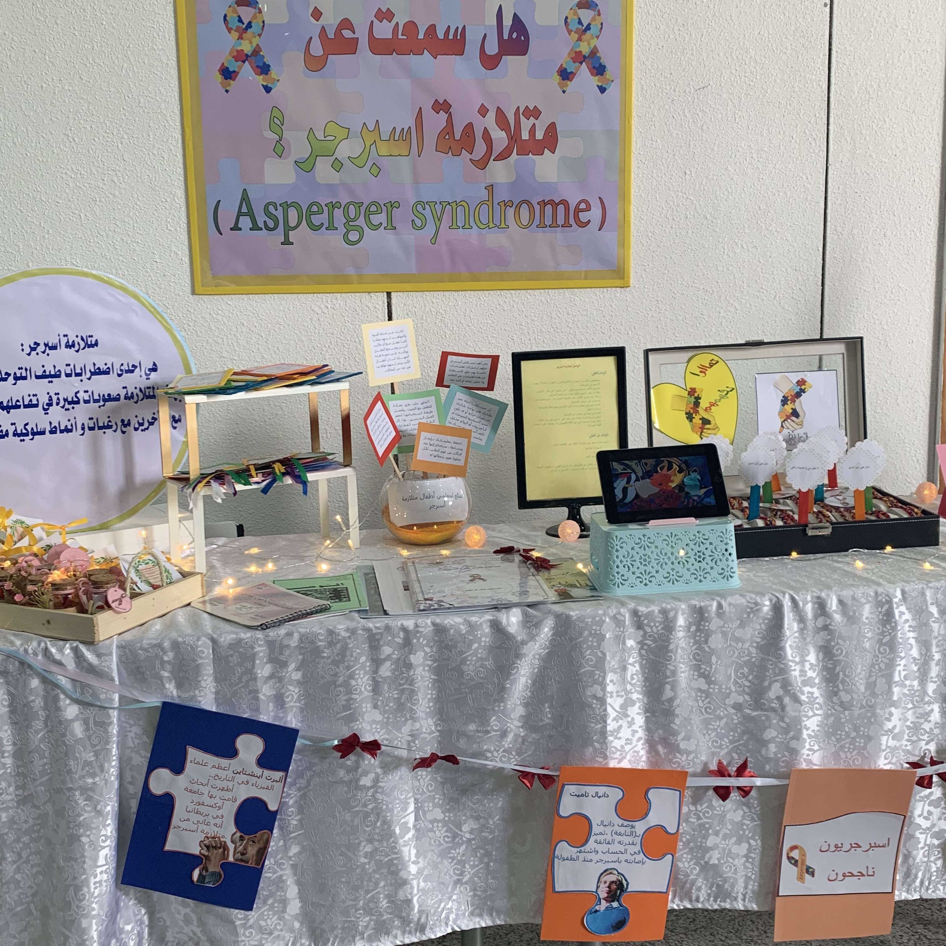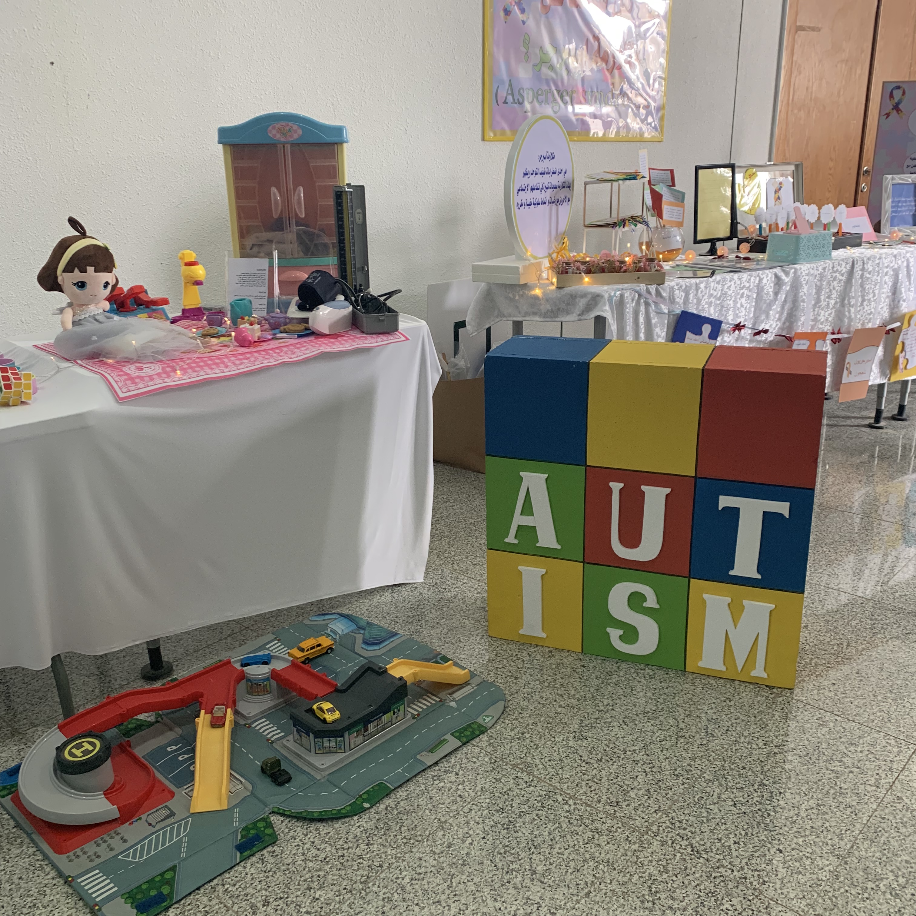 أقام قسم التربية الخاصة بالتعان مع وحدة العمل الطلابي يوم الأحد 17-7-1440هـ,معرض (اليوم العالمي للتوحد) تحت إشراف أ.بشرى العنزي و أ. موضي الهويمل. وكان الهدف الرئيسي للفعالية توعية طالبات الكلية باضطراب طيف التوحد والاحتفال بهذه المناسبة.واحتوى المعرض على ركن متلازمة اسبرجر - ركن التعلم باللعب - ركن المهارات اليومية - وركن الألعاب المناسبة لأطفال التوحد .ويهدف المعرض لتعريف المجتمع بحالة التوحد وطيف التوحد,و تفعيل الدور التوعوي والثقافي لدى فئات المجتمع الطلابي المختلف,و الدعم النفسي والاجتماعي لمن لديهم أطفال من ذوي التوح,والتوعية عن البرامج التربوية والتأهيلية الخاصة بهم,والتعريف بحقوق الأشخاص ذوي الإعاقة في جميع المجالات وخاصة ( التعليمية، والدمج المجتمعي(وتبادل الأفكار والرؤى والتجارب والخبرات.واستهدف المعرض جميع طالبات الكلية ومنسويها.