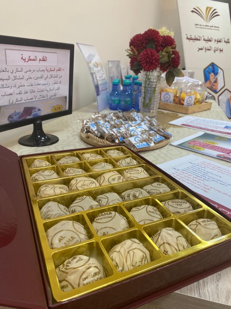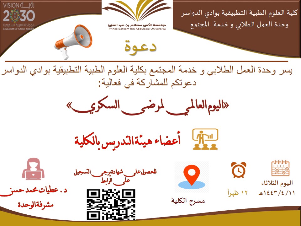 نظمت وحدة العمل الطلابي (ممثلة في الأنشطة الثقافية و الإجتماعية والبرامج التطوعية) و وحدة خدمة المجتمع بكلية العلوم الطبية التطبيقية بوادي الدواسر - جامعة الأمير سطام بن عبد العزيز فعالية «اليوم العالمي لمرضى السكري». و ذلك يوم الثلاثاء الموافق 11/4/1443هـ الساعة 12 ظهرا بمسرح الكلية.