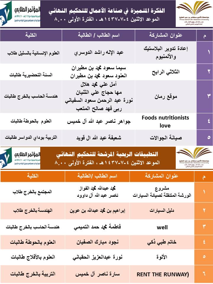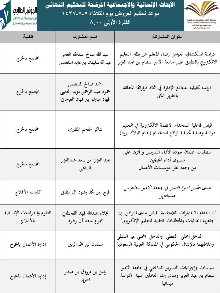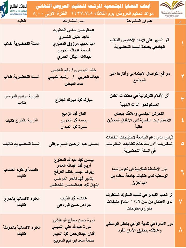 والعمادة تدعو الطلاب والطالبات للحضور في المواعيد المحددة للتحكيم لعرض مشاركاتهم العلمية أمام لجان التحكيم المختلفة.