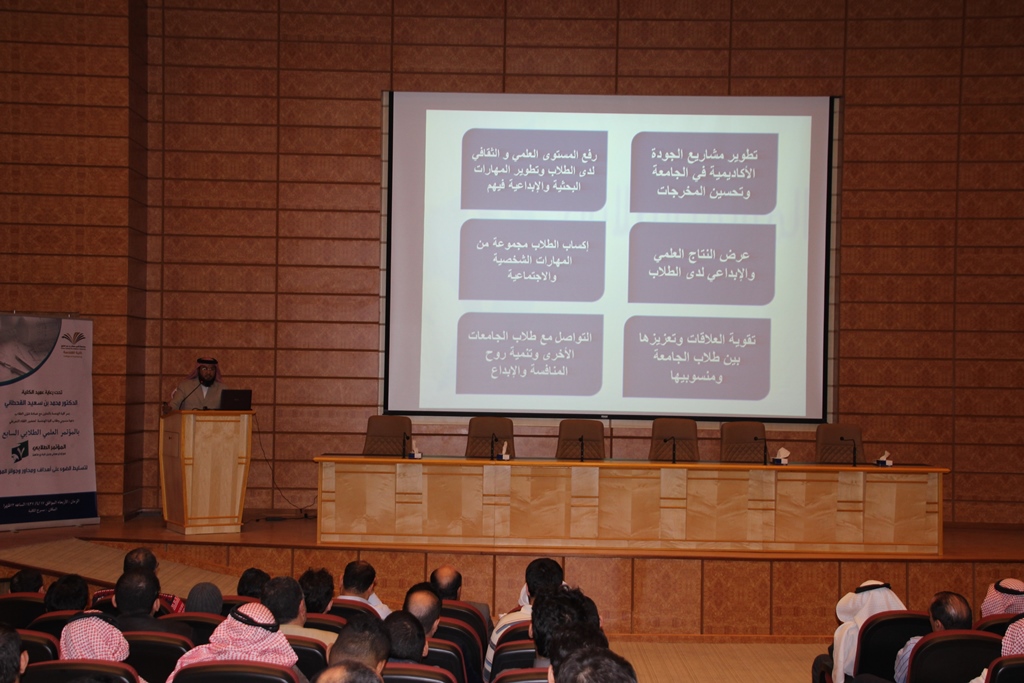 بعد ذلك قدم أمين المؤتمر العلمي الدكتور /عمر بن محمد دين عرضاً تعريفياً شرح فيه أهمية المؤتمر وأهدافه ومحاوره وآلية المشاركة في المؤتمر في مختلف محاوره، كما أشار إلى الجوائز القيمة والمجزية التي تقدمها عمادة شؤون الطلاب للمتميزين في مشاركاتهم من الطلاب والمشرفين وكذلك منسقي الكليات، ثم شرح أمين المؤتمر المراحل المتعددة لتنفيذ الاعمال و البرامج والدورات التدريبية وورش العمل العلمية للتحضير للمؤتمر وتأهيل الطلاب ومشاركاتهم، كما ذكر الدكتور في اللقاء مجموعة من التنبيهات المهمة للطلاب متعلقة بالمشاركات المختلفة التي يعدها الطلاب للمؤتمر، كما كان في آخر فقرات الللقاء عرضٌ لبعض الصور للأعمال والبرامج التي أقيمت العام الماضي على مستوى العمادة وكليات الجامعة و المؤتمر العلمي السادس في مدينة جدة.