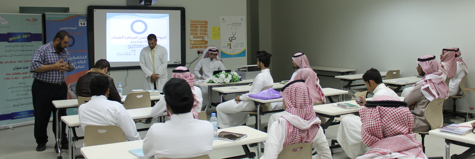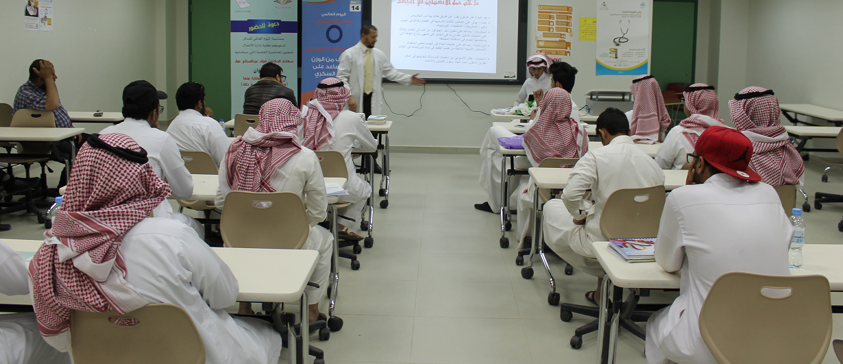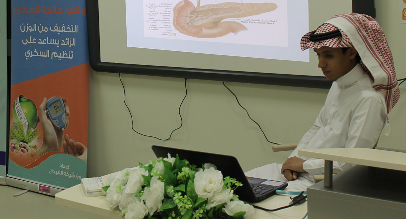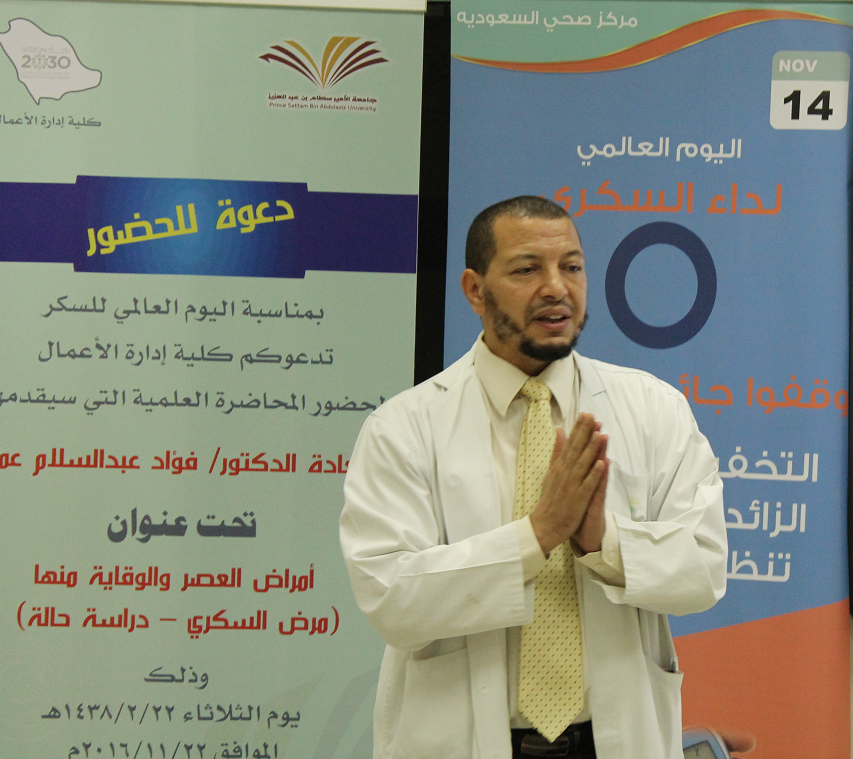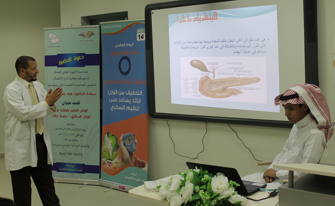 نظمت لجنة الأنشطة الطلابية بكلية إدارة الأعمال بالخرج بمناسبة اليوم العالمي لمرض السكري، برعاية عميد الكلية الدكتور ناصر بن سعد القحطاني، وبجهود تنسيقية مميزة للطالب محمد بن فهد العتيبي، محاضرة توعويّة بعنوان: (أمراض العصر والوقاية منها.. داء السكري دراسة حالة)، قدّمها الدكتور فؤاد عبد السلام عمّار من مركز صحي حي السعوديّة، أكد خلالها أن المملكة ممثلة في جميع القطاعات الصحية سعت إلى افتتاح مراكز عديدة لعلاج السكري؛ إلا أن الركيزة الرئيسية في علاج هذا المرض هو التعليم، والذي ثبت أنه يساعد بشكل كبير على التقليل من نسب الإصابة ويقلل من مضاعفات المرض سواء المضاعفات الحادة أو المزمنة، وهو أي (التثقيف الصحي) أكثر الوسائل فعالية لتخفيض تكاليف العلاج. ويركز اليوم العالمي للسكري على التعليم والتثقيف الصحي بمرض السكري فهو مفتاح العلاج بالنسبة للمرض بنوعيه الأول والثاني.