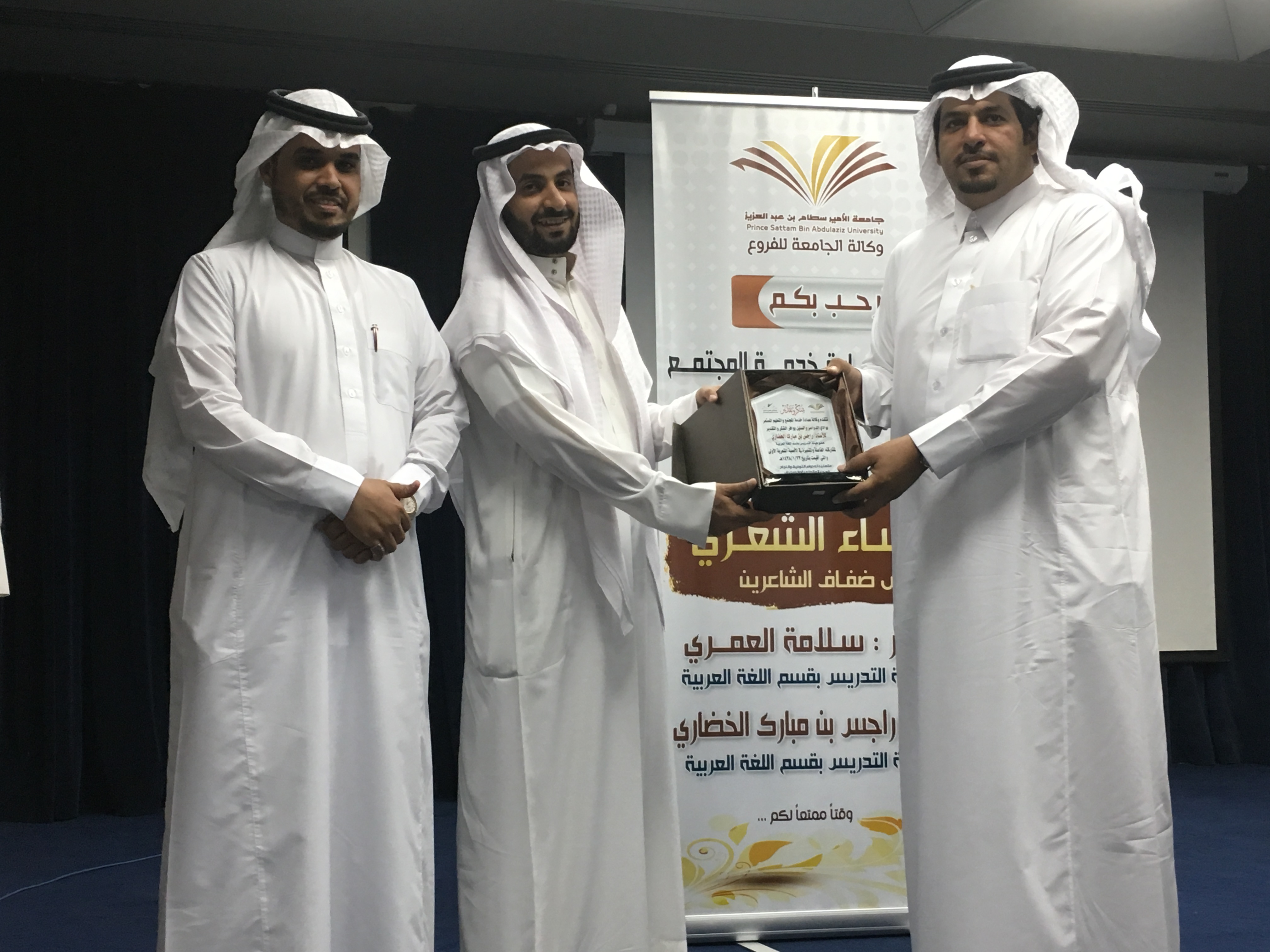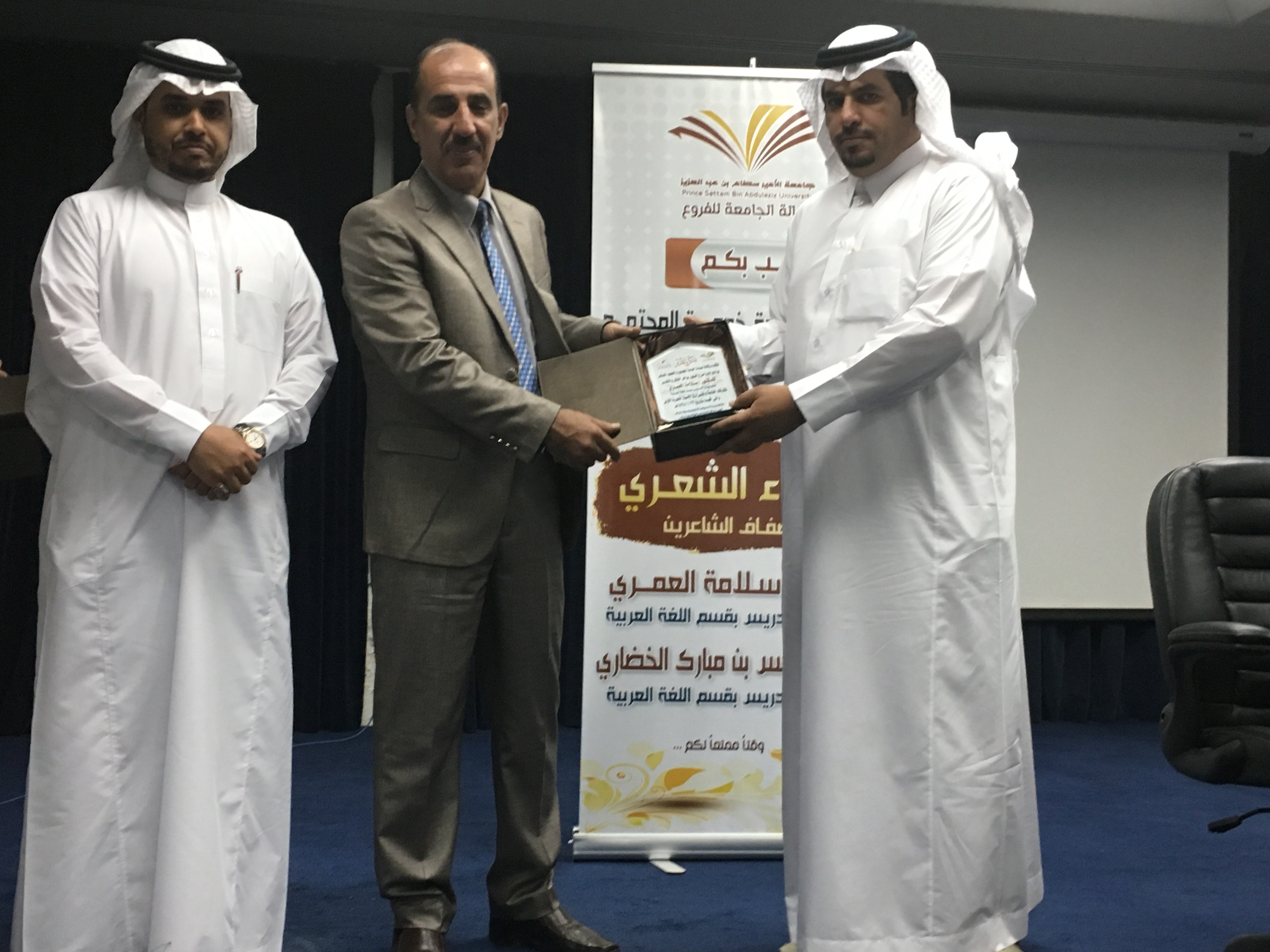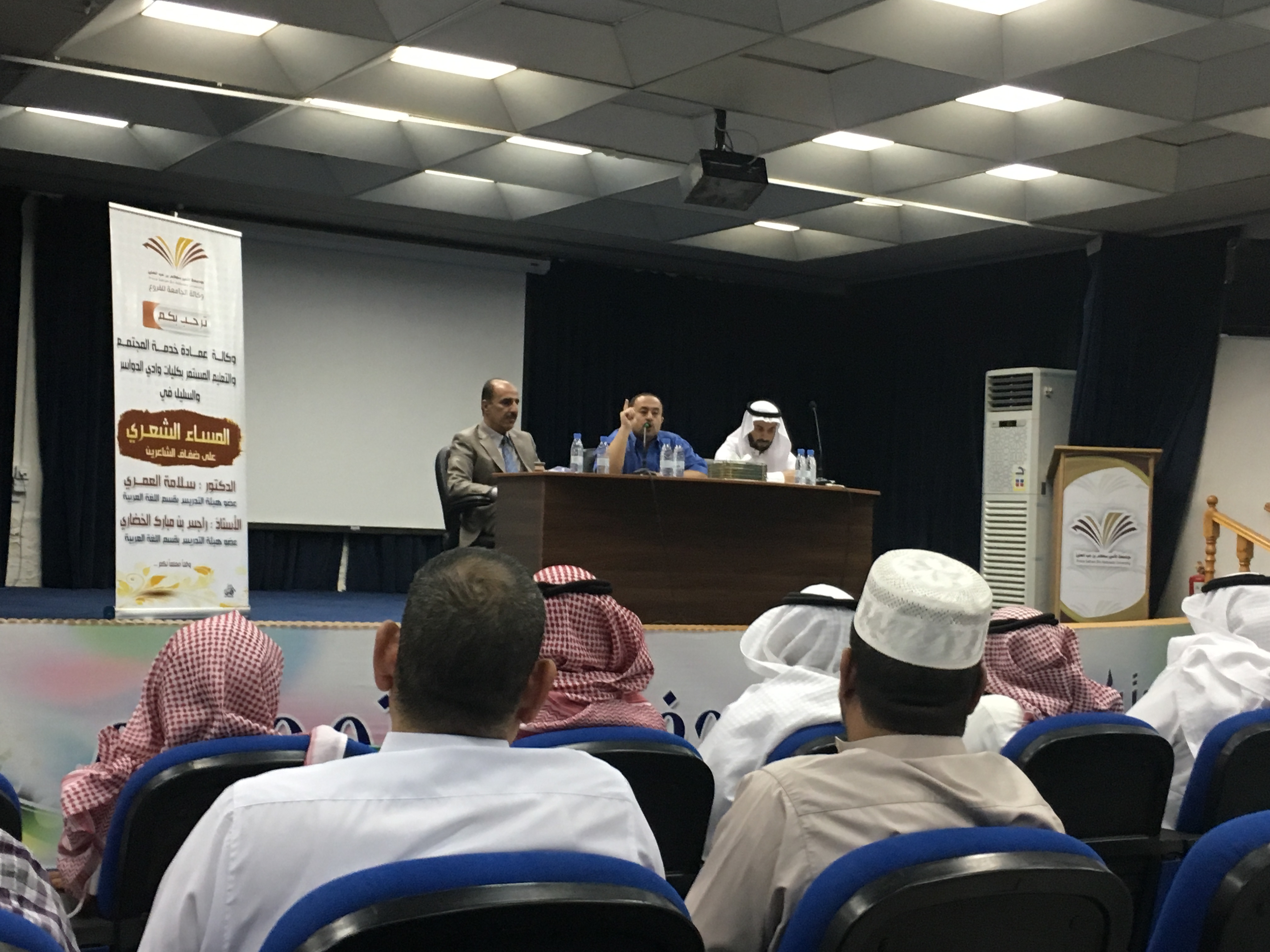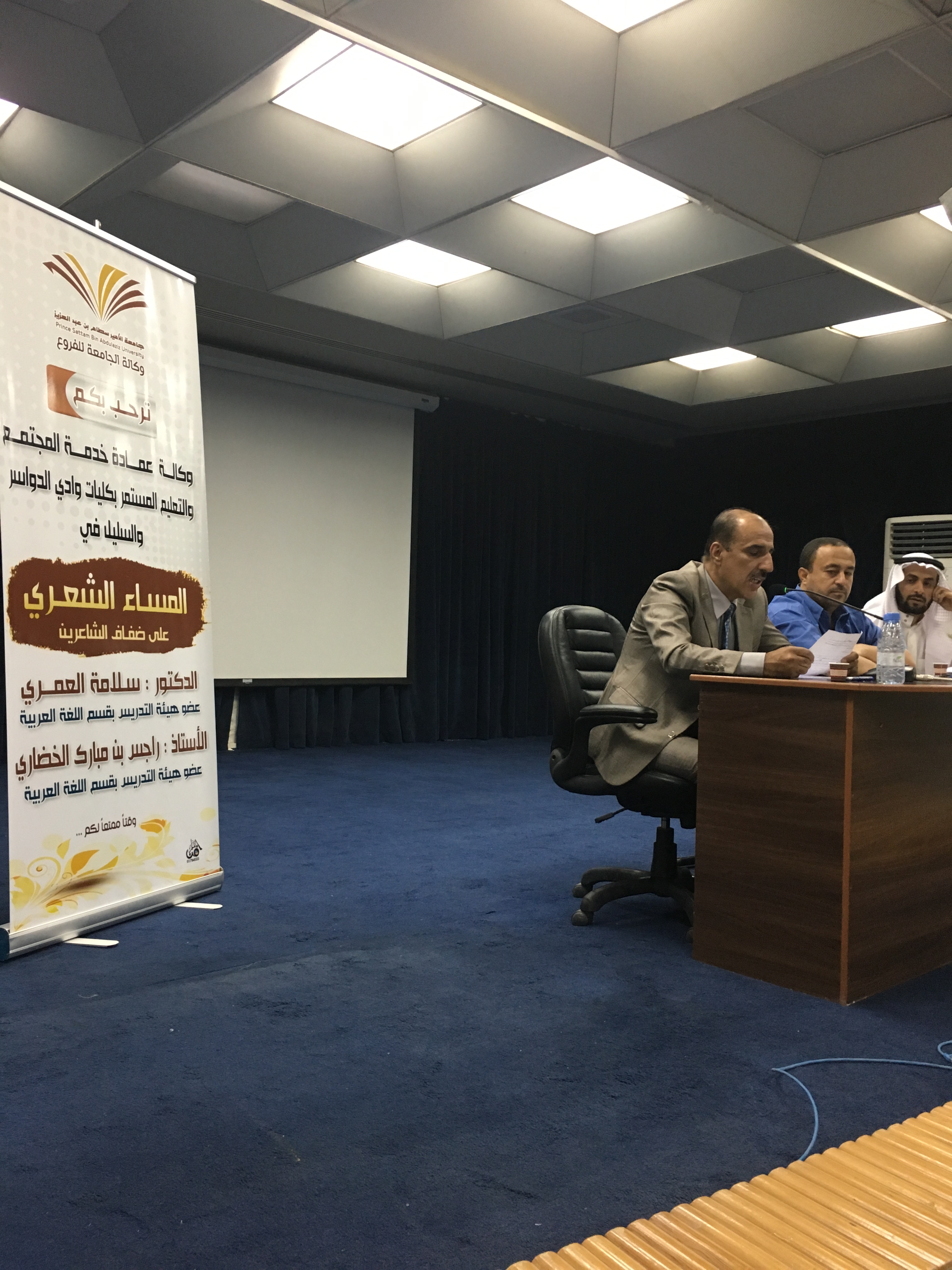 أقامت وكالة عمادة خدمة المجتمع والتعليم المستمر بالفروع بإشراف وكالة الجامعة للفروع مساء أمس الثلاثاء 1438/1/24 أمسية شعرية أحياها كل من الدكتور سلامة العمر ي والاستاذ راجس بن مبارك الخضاري عضوا هيئة التدريس بقسم اللغة العربية بكلية الاداب والعلوم بالوادي وذلك على مسرح كلية الهندسة بالمحافظة ، وبحضور المشرف على وكالة الجامعة للفروع د. .عبدالله بن محمد الصقر ووكيل عمادة خدمة الممجتمع والتعليم المستمر د. خالد بن مطر السهلي وعمداء الكليات المحافظة د. ناصر بن محمد ال عشوان عميد كلية التربية ود. مجاهد بن محمد ال ضيف عميد كلية الهندسة ود. سفر بن بخيت المدرع عميد كلية الاداب والعلوم ووكلائهم ورئيس وحدة التوعية الفكرية أ.د خالد بن ابراهيم الدبيان ومساعد عميد شؤون الطلاب بالجامعة الأستاذ / جمال بن محمد الحمداء