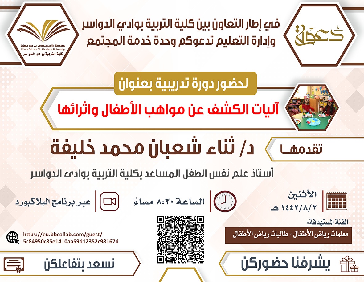 بتوجيه ومتابعة عميد كلية التربية بمحافظة وادي الدواسر الدكتور/ ماجد بن علي الشريدة ، نظمت وحدة خدمة المجتمع بكلية التربية أمسية احتفالية بمناسبة اليوم الخليجي للموهبة والإبداع بعنوان: (آليات الكشف عن مواهب الأطفال وإثرائها)، وذلك يوم الإثنين 2/8/1442، في تمام الساعة الثامنة والنصف مساءً، عبر برنامج البلاك بورد، قدمت الدورة سعادة الدكتورة / ثناء شعبان خليفة أستاذ علم نفس الطفل المساعد بالكلية.