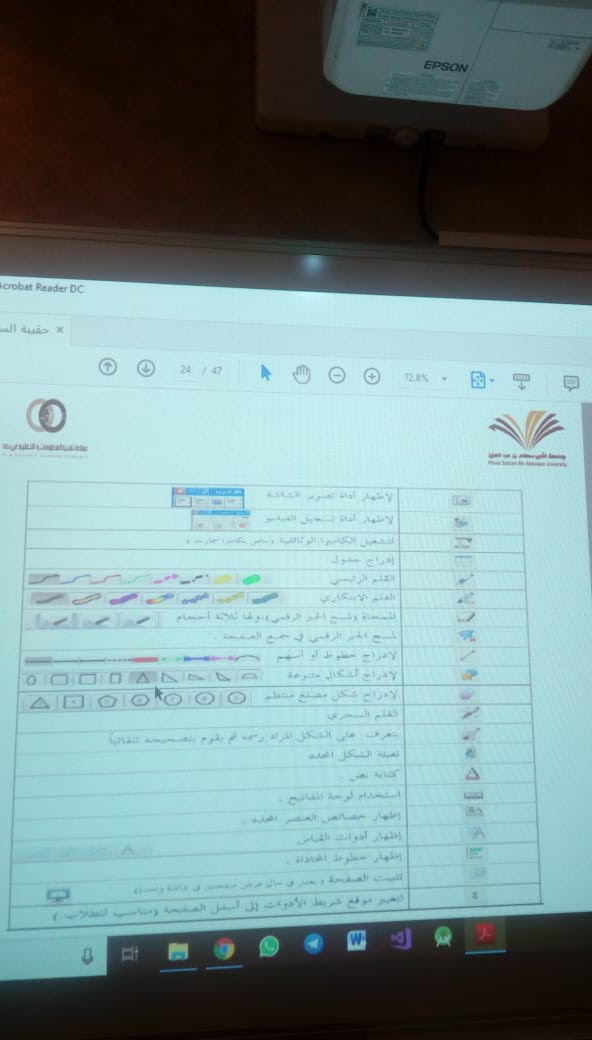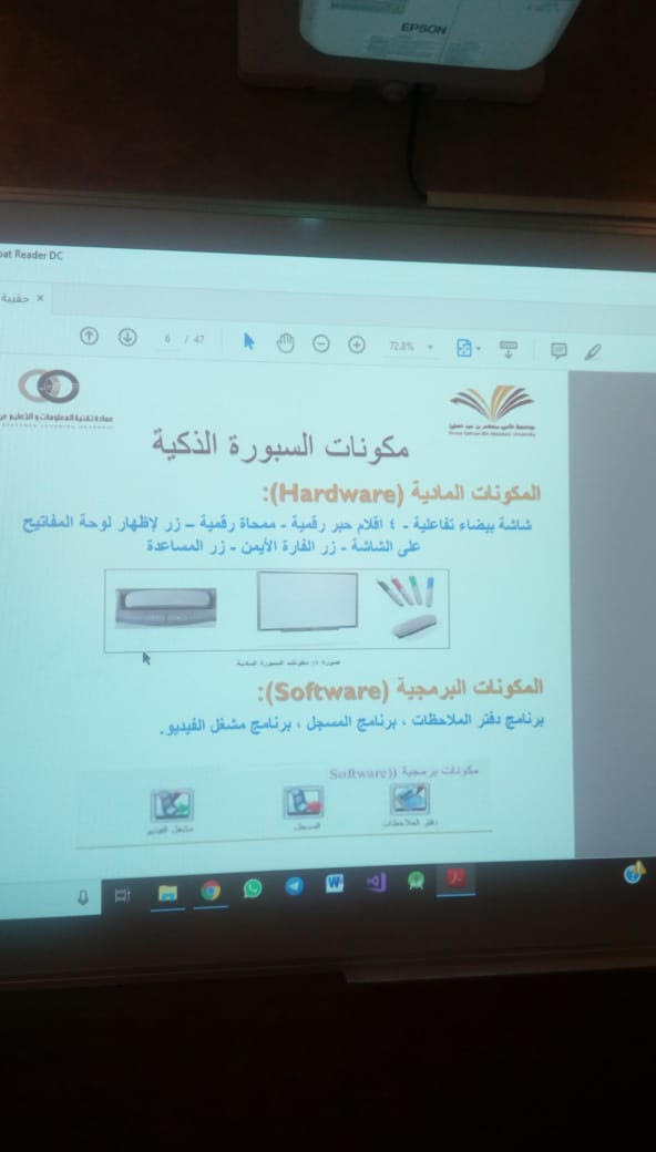 في يوم الخميس الموافق 23/6/1440هـ تم عقد دورة تدريبية تحت عنوان: "كيفية استخدام السبورة الذكية" من تقديم الأستاذة/ عزة النيل، والتي تعد إحدى دورات وبرامج الملتقى التقني الأول المقام في كلية المجتمع بالخرج حيث اشتملت الدورة على عدة محاور، وهي :