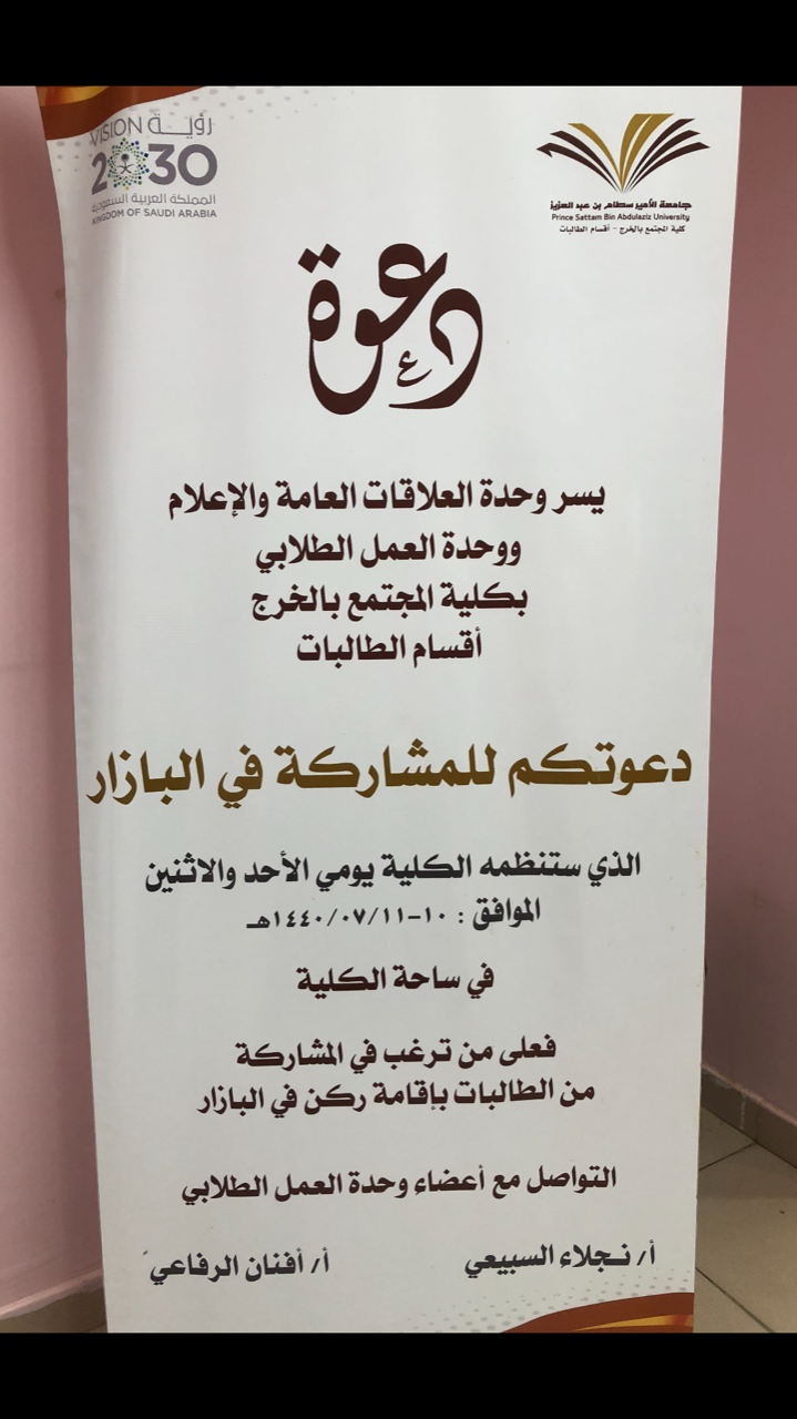 بحضور سعادة وكيلة كلية المجتمع بالخرج لأقسام الطالبات الدكتورة/ أمينة بنت عبد الرحمن المشحن، وبإشراف وحدة العلاقات العامة والإعلام ووحدة العمل الطلابي في الكلية، تم افتتاح بازار " أنامل الإبداع " وذلك خلال الفترة من 10 الى 1440هـ /11/7