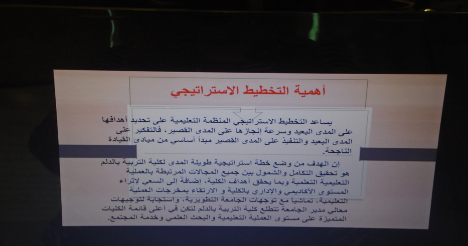 كما قدمت الدكتورة سحر عبده مساعد العميدة للشؤون التعليمية والأكاديمية استطلاع حول الخطة الإستراتيجية للكلية ، وبيان الأقسام والبرامج المتاحة حالياً بالكلية، كما قدم عرضاً عن ابرز مرافق الكلية والمعامل الموجودة بالكلية وأبرز التقنيات التي تحتويها هذه المعامل ، وما تقدمه الكلية من ورش ومحاضرات تدريسية لخدمة المجتمع ، والوسائل المقترحة لربط الكلية بالمجتمع وفي النهاية تم استعراض أهم انجازات الكلية خلال السنوات الماضية.