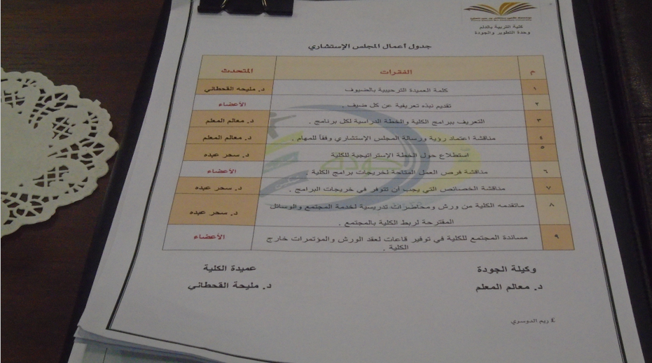 بعد ذلك ناقش المجلس عدد من بنود جدول الأعمال حيث تم مناقشة رسالة وأهداف الكلية وبرامجها الاكاديمية بالإضافة الى مخرجاتها التعليمية. كما ناقش عدد من المبادرات وخاصة فيما يتعلق بالشراكة المجتمعية وذلك بغرض زيادة فرص التعاون والشراكة بين الكلية والمجتمع ولتحسين مهارات وقدرات الطالبات لتلبى متطلبات سوق العمل والاحتياجات المجتمعية.