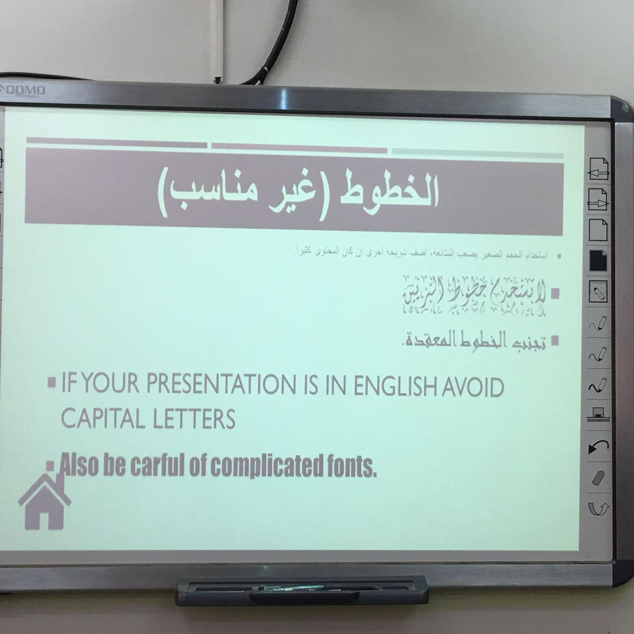 خيّر د. عبد العزيز السنوسي العضوات الحاضرات بين عرض باللغة العربية أو اللغة الإنجليزية فاختارت العضوات اللغة العربية. بدأت الورشة بأهم خاصيات العروض الفعالة باستعمال برنامج بوربوينت (PowerPoint) ثم عرض لكل خاصية الحالة المثالية والحالة الغير مناسبة بداية من هيكل الشريحة مرورًا باستعمال الأيقونات والخطوط والألوان والخلفية و العروض المرئية و الصوت والروابط والمخططات. اختتمت الورشة بتقديم جملة من النصائح والتوصيات لأفضل استعمالات برنامج العروض التقديمية، بعدها أعطى الدكتور مساحة لاسئلة الحاضرات والإجابة عليها. يُذكر أن الورشة لاقت استحسان الحاضرات من عضوات هيئة التدريس.