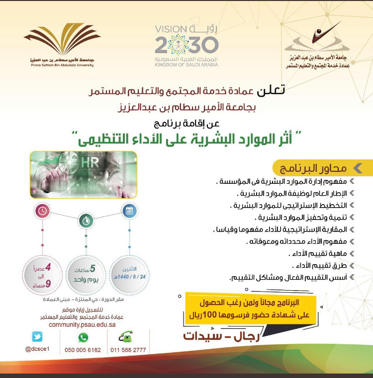 direction:rtl;unicode-bidi:embed">ينطلق مساء اليوم الاثنين البرنامج التدريبي ( أثر الموارد البشرية على الآداء التنظيمي ) الذي سيقام في مبنى عمادة خدمة المجتمع والتعليم المستمر بجامعة الأمير سطام.