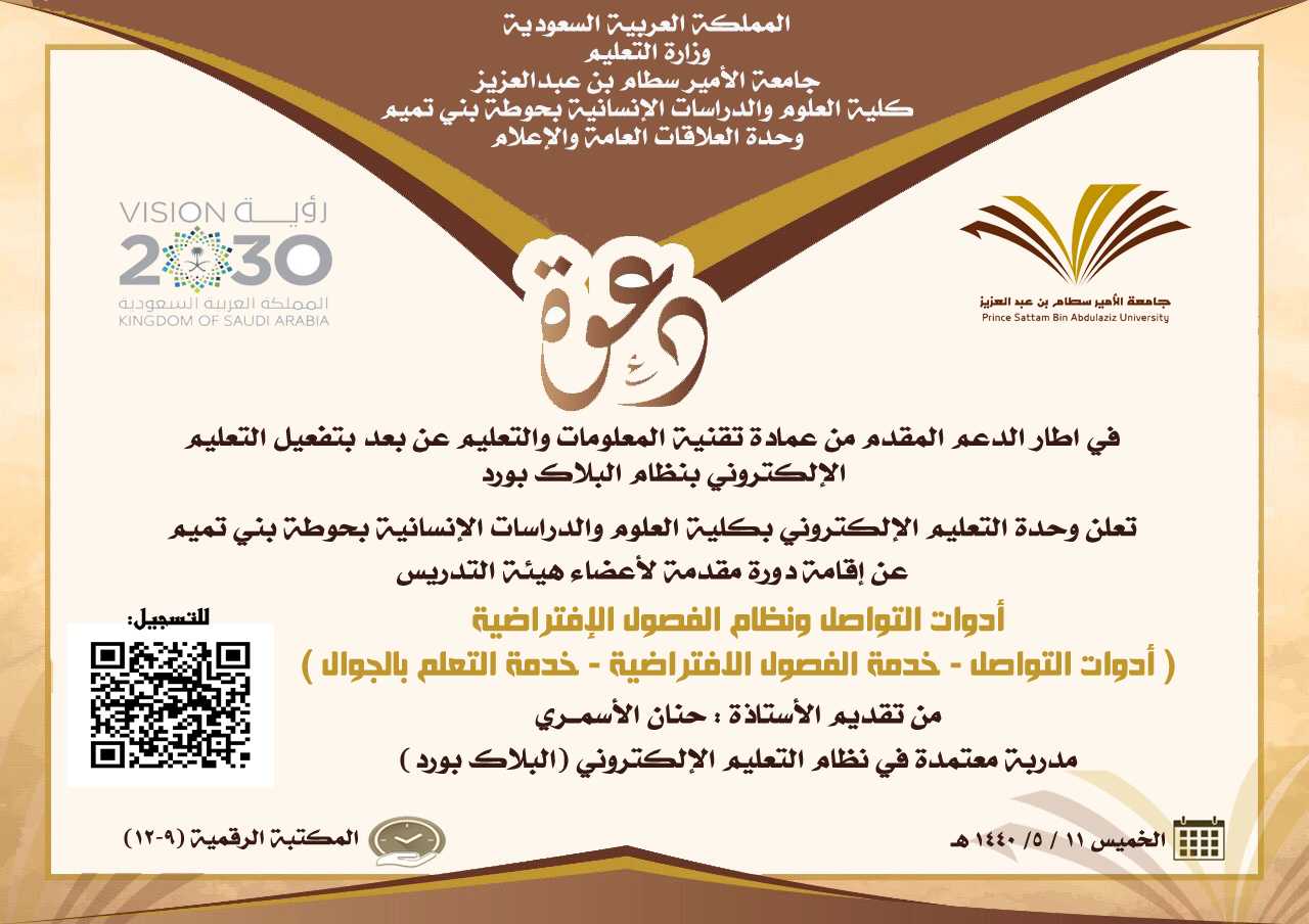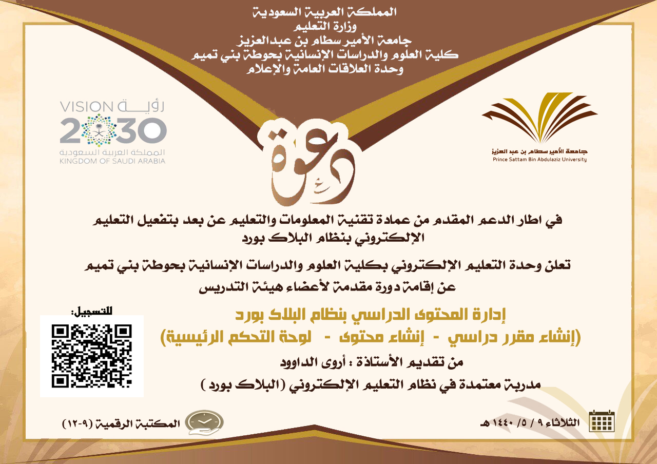 في إطار الدعم المقدم من عمادة تقنية المعلومات والتعليم عن بعد، نظمت وحدة التعليم الإلكتروني بكلية العلوم والدراسات الإنسانية بحوطة بني تميم سلسة من الدورات التدريبية لعضوات هيئة التدريس على نظام البلاك بورد. افتتحت هذه الدورات يوم الإثنين الموافق 9 /5/ 1440 هـ بإقامة دروة تدريبية بعنوان (إدارة المحتوى الدراسي بنظام البلاك بورد) من إعداد وتقديم الأستاذة أروى الداوود عند الساعة التاسعة صباحاً في المكتبة الرقمية. تم خلال الدورة التدريب على طريقة إنشاء المقرر الدراسي في نظام البلاك بورد وإنشاء المحتوى. كما التدريب على الإعدادات العامة المتعلقة بلوحة التحكم الرئيسية. كما ينفذ غداً دروة بعنوان التقييمات والاختبارات في نظام البلاك بورد للأستاذة فاطمة الكليب. شهدت الدورة حضور كبير لأعضاء هيئة التدريس حيث تم التطبيق العملي على جميع محاور الدورة.