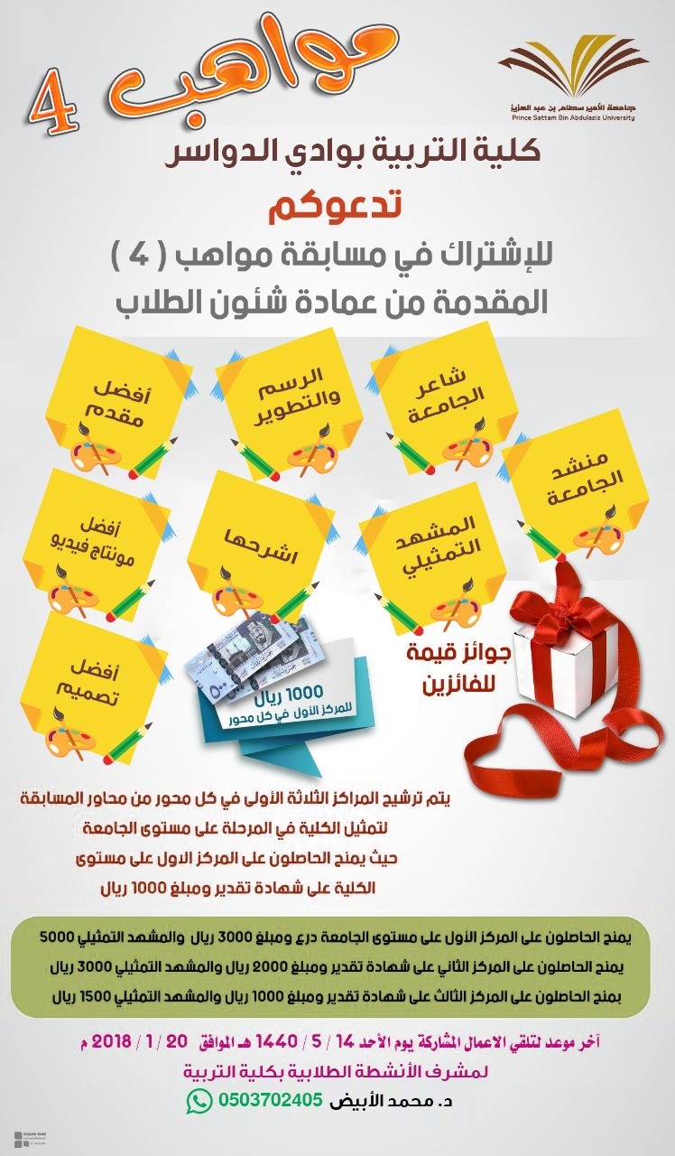 ضمن المساهمة في تطوير القدرات واكتشاف الموهب تعلن عمادة كلية التربية بمحافظة وادي الدواسر ممثلة في إدارة النشاط الطلابي بدعوة لطلاب الكلية من يرغب للمشاركة في مسابقة: ” مواهب4 ” .