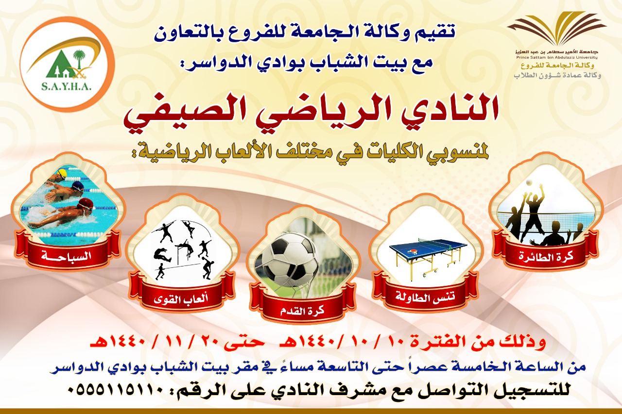 بدأت وكالة الجامعة للفروع بجامعة الامير سطام بن عبدالعزيز ممثلةً بوكالة عمادة شؤون الطلاب بالفروع النادي الصيفي للأنشطة الرياضية بمقر بيت الشباب بالمحافظة وذلك لمنسوبي كليات محافظتي وادي الدواسر والسليل .