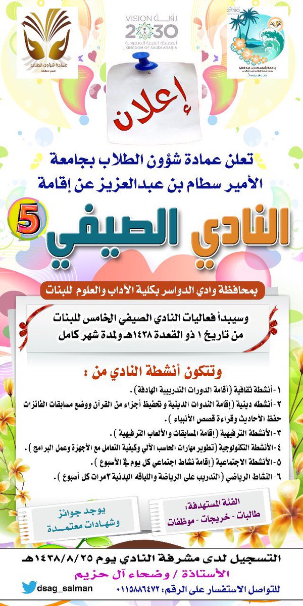 تعتزم عمادة شؤون الطلاب في جامعة الامير سطام بن عبدالعزيز إقامة النادي الصيفي الخامس للطالبات خلال الفترة من ١٤٣٨/١١/١ لمدة شهر وذلك في كلية الآداب والعلوم بوادي الدواسر .