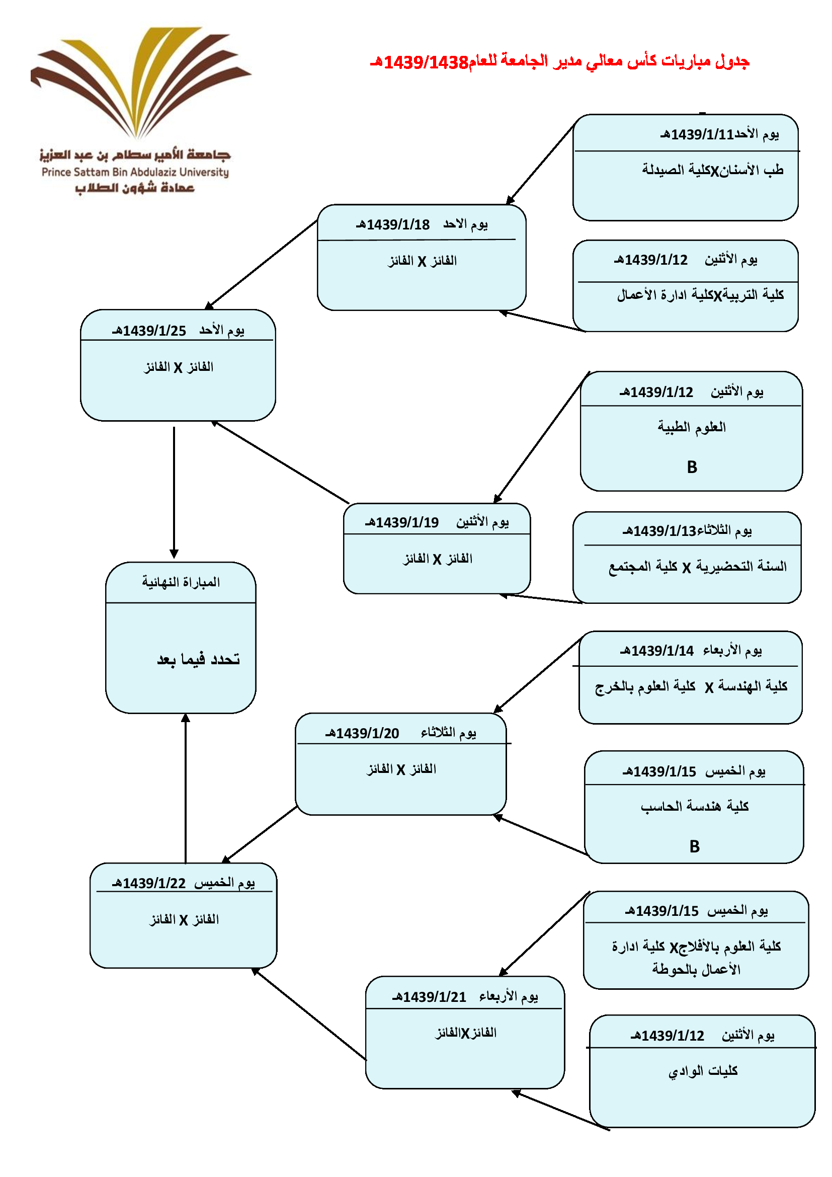 تنظم عمادة شؤون الطلاب بجامعة الأمير سطام بن عبدالعزيز بطولة كأس معالي مدير الجامعة لكرة القدم في نسختها الثامنة بين كليات الجامعة وذلك خلال الفترة من 11 – 25 / 1 / 1439هـ بمجمع الخليج الرياضي بنظام خروج المغلوب.