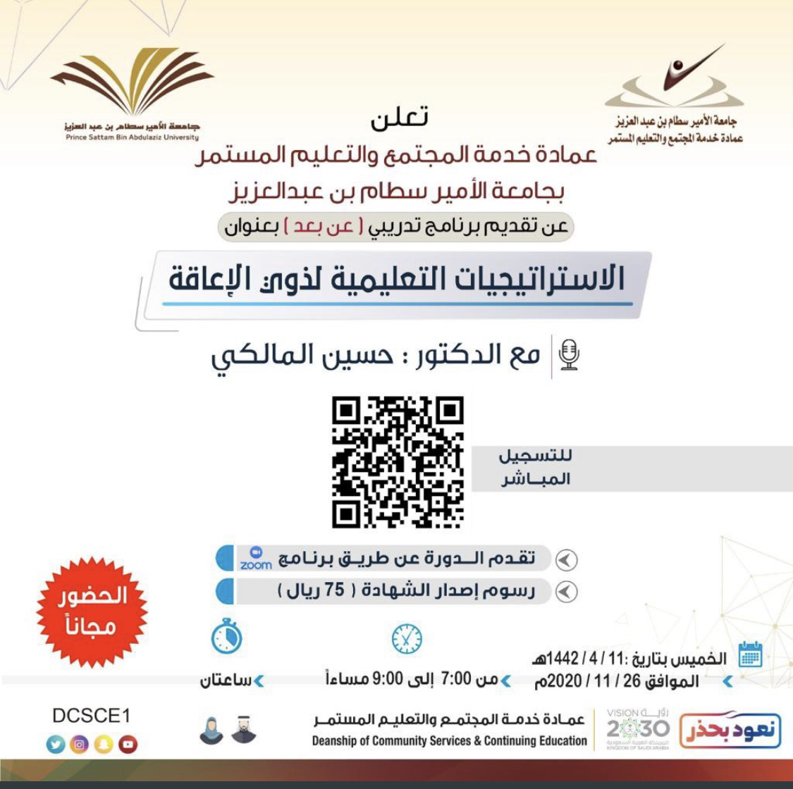 أما في مساء يوم الخميس 11/4/1442 فستنفذ دورة متخصصة في" الاستراتيجيات التعليمية لذوي الإعاقة "