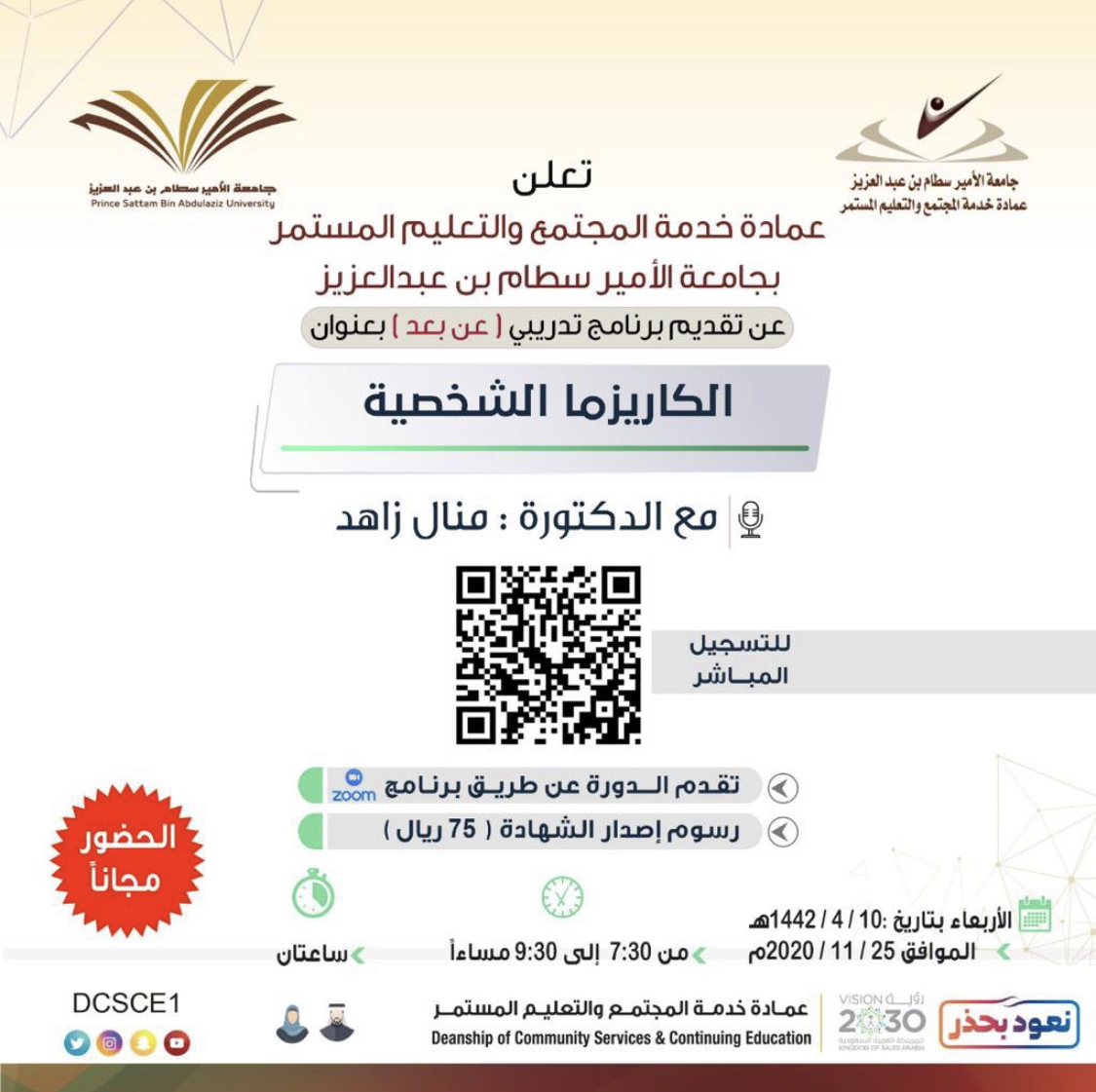 وفي مساء يوم الاربعاء 10/4/1442 تقدم الدكتورة : منال زاهد دورة بعنوان : " الكاريزما الشخصية ".