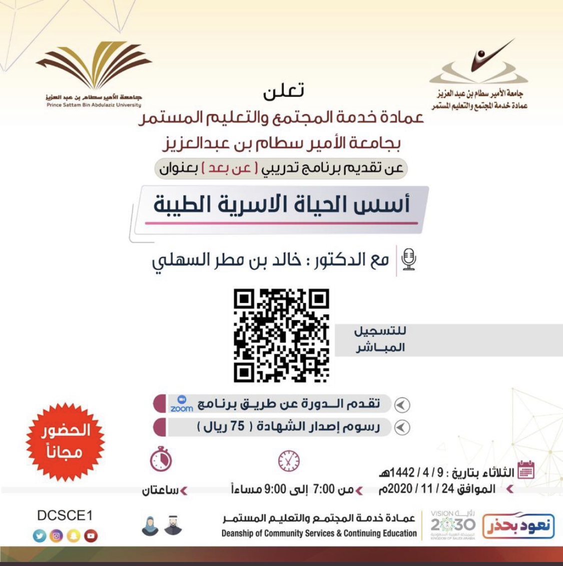 تنطلق غداً الثلاثاء فعاليات الأسبوع الرابع من البرامج التدريبية لعمادة خدمة المجتمع والتعليم المستمر بجامعة الأمير سطام بن عبدالعزيز ، حيث ستقام دورة تدريبية بعنوان : " أسس الحياة الأسرية الطيبة " يقدمها الدكتور : خالد السهلي .