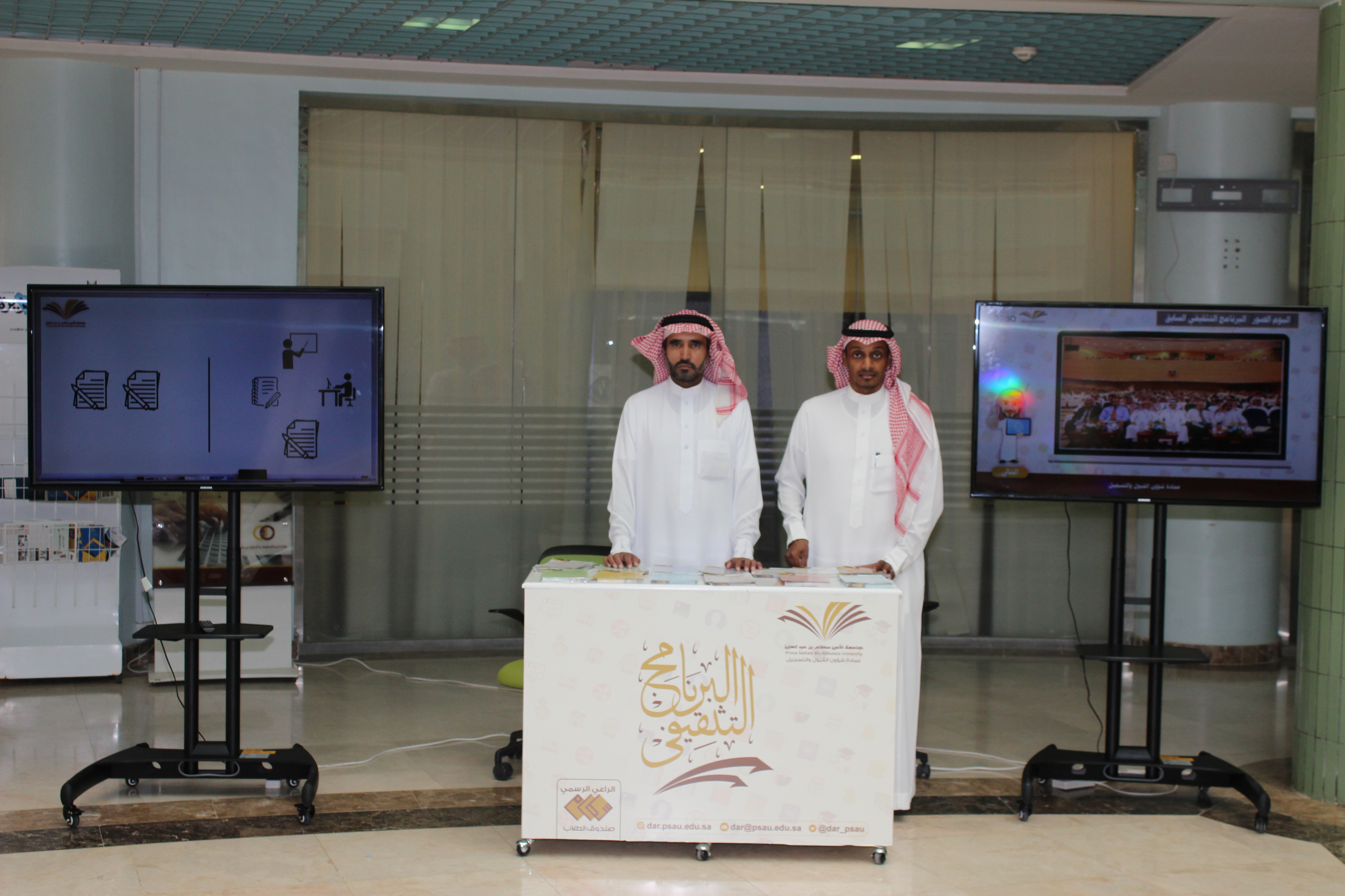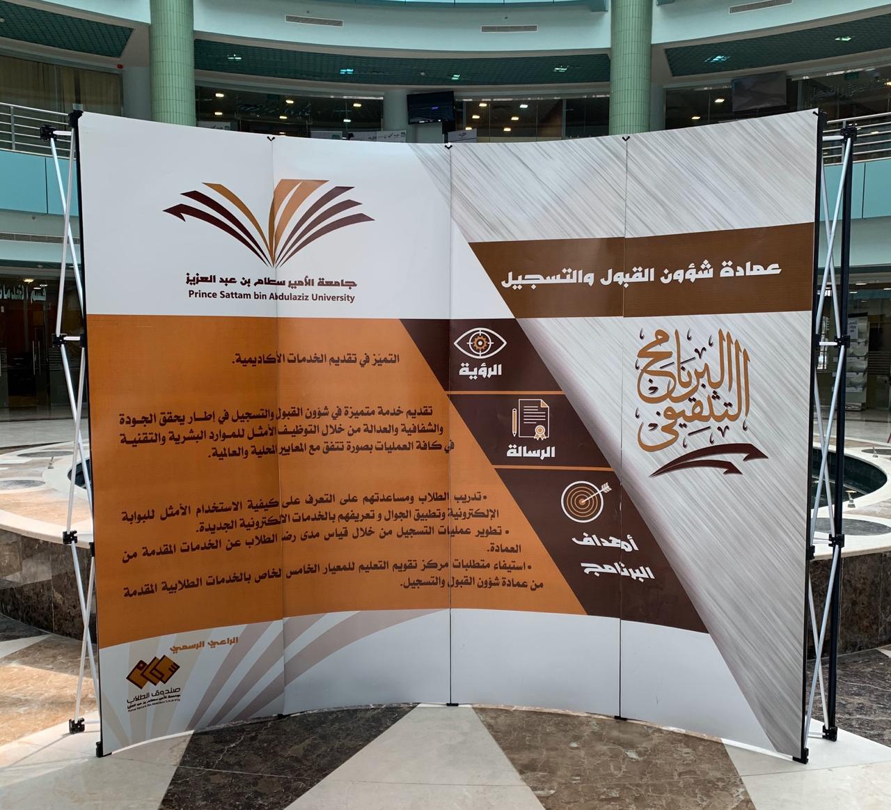 انطلقت صباح أمس الثلاثاء 2 صفر 1441هـ فعاليات البرنامج التثقيفي لعمادة شؤون القبول والتسجيل للفصل الدراسي الأول للعام الجامعي 1441هـ في بهو مبنى كلية العلوم والدراسات الإنسانية - كلية التربية ، وأوضح سعادة عميد شؤون القبول والتسجيل الدكتور عبدالعزيز بن محمد الصقر بأن هذا البرنامج يهدف لتعزيز الوعي بأنشطة العمادة، وسيقام في كافة الكليات والفروع في جامعة الأمير سطام بن عبدالعزيز(للطلاب والطالبات) معرباً عن أمله في أن يسهم هذا البرنامج في زيادة الوعي للطلاب والطالبات بأنشطة العمادة والتي تتمثل من خلال الأهداف المحددة للبرنامج وهي على النحو التالي: