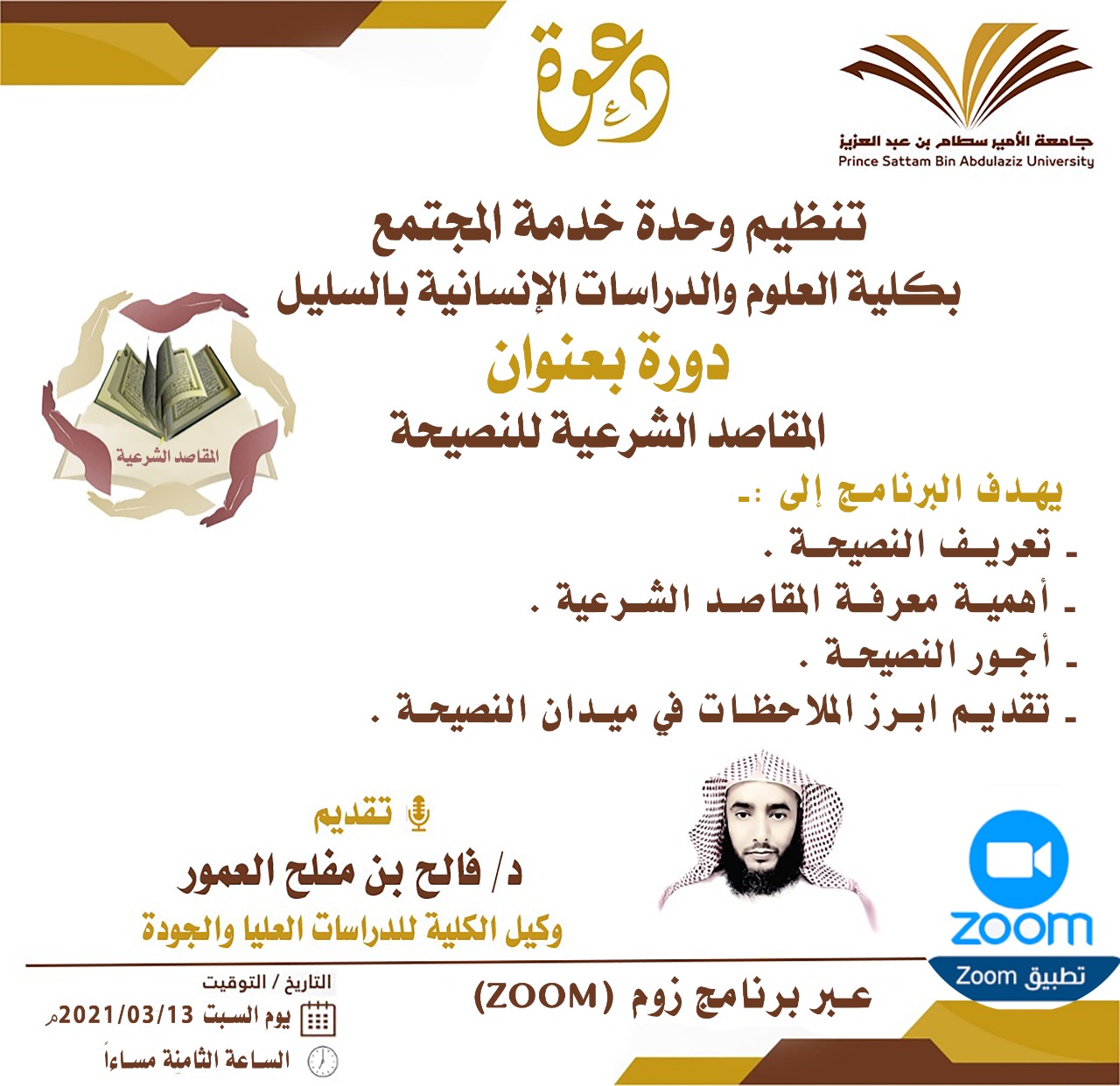 تمثلت انطلاقة المبادرة بتقديم دورة عن بعد عبر (منصة زووم) بعنوان : المقاصد الشرعية للنصيحة قدمها سعادة الدكتور /فالح بن مفلح العمور وكيل الكلية للدراسات العليا و الجودة الاستاذ المساعد بقسم الدراسات الاسلاميه بالكلية و قد تمثلت محاور الدورة في :