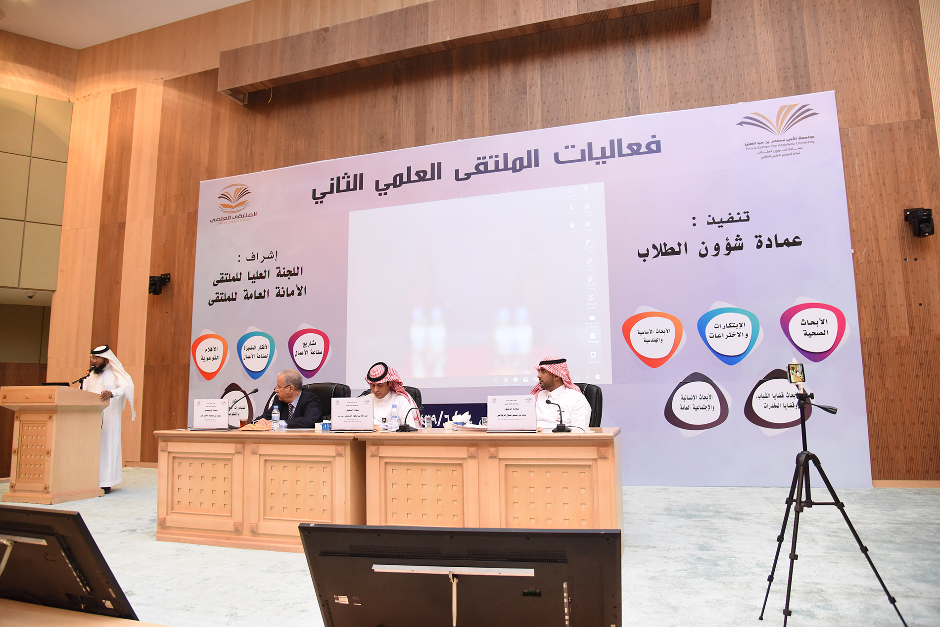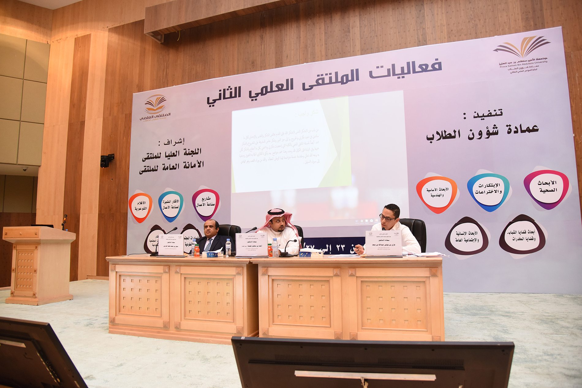 برعاية معالي مدير جامعة الأمير سطام بن عبدالعزيز أ.د عبدالعزيز بن عبدالله الحامد بدأت اليوم الأحد الموافق 23 / 6 / 1439هـ فعاليات الملتقى العلمي الثاني والذي تنظمه عمادة شؤون الطلاب خلال الفترة 23- 27 / 6 / 1439هـ بمسرح إدارة الجامعة (كلية الطب مبنى 6) للطلاب , ومسرح مبنى الهداية للطالبات.