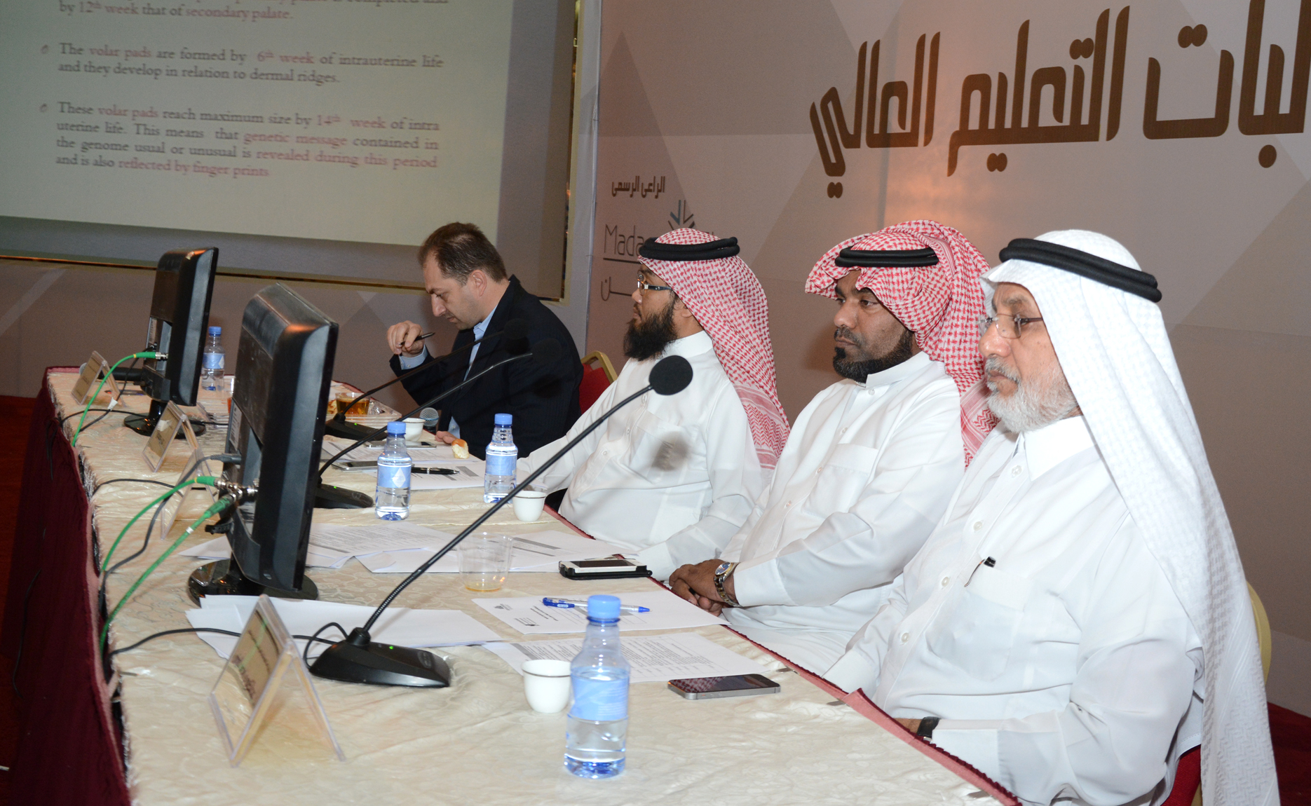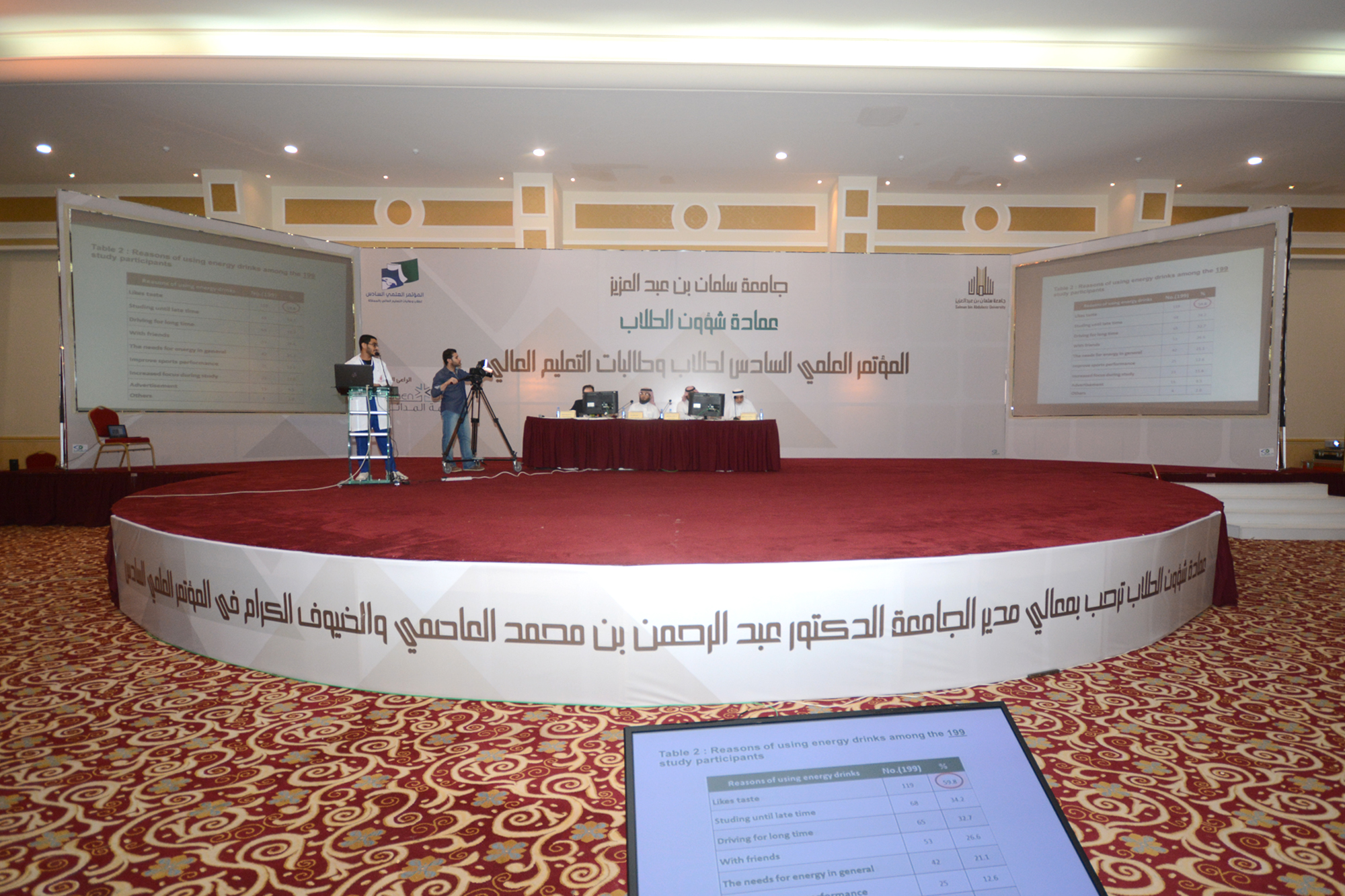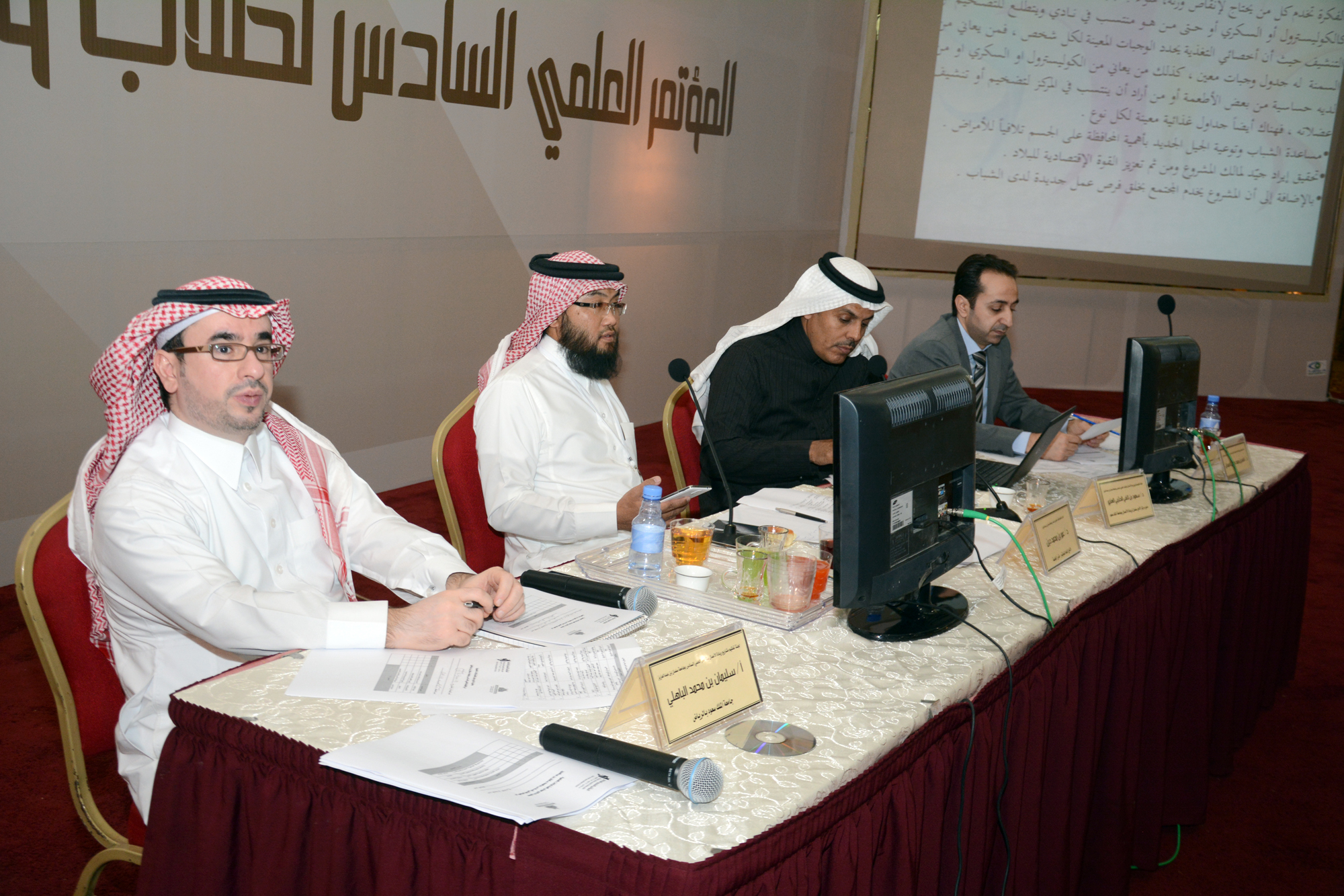 ففي اليوم الأول من فعاليات المؤتمر الأحد 12/4/1436هـ وفي الفترة الأولى ناقشة لجنة التحكيم على مسرح المؤتمر وأمام الحضور البحوث المقدمة من قبل الطلاب والطالبات المشاركين في محور الأبحاث الصحية في المؤتمر والبالغ عددها خمسة عشر بحثاً من مختلف الكليات الصحية بالجامعة .