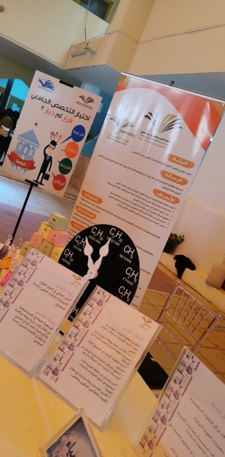 تم بحمد الله افتتاح فعاليات برنامج (تخصصك) تحت رعاية كريمة من سعادة رئيس الجامعة الأستاذ الدكتور عبدالرحمن الطلحي وبحضور وكيلة الجامعة لشؤون الطالبات الدكتورة بشرى الحماد وذلك يوم الأثنين الموافق ١٤٤٣/٨/٥هـ في بهو عمادة السنة التحضيرية شطر الطالبات وبحضور وكيلة العمادة لشؤون الطالبات د.أمل بنت صالح الشمراني وعدد من منسوبات الجامعة ، حيث استمع الحضور لشرح حول برنامج تخصصك وأهدافه وماتحتويه أركان المعرض ومايقدم به ، وبعد ذلك قام الجميع بجولة في الأركان والذي شاركت به جميع الكليات في كافة المسارين التي يتخصصن بها طالبات السنة التحضيرية وهي الصحي والهندسي،حيث يتمثل المسار الصحي في كلية الطب وكلية العلوم الطبية التطبيقية وكلية الصيدلة والمسار الهندسي العلمي في كلية العلوم والدراسات الإنسانية وكلية هندسة وعلوم الحاسب وتحرص عمادة السنة التحضيرية على إقامة هذا البرنامج بالتعاون مع الكليات بهدف تجلية الرؤية أمام الطالبات عبر آليات معينة تعينهن على اختيار التخصص المناسب،والذي يتناسب مع قدراتهن العلمية والذهنية ،والإجابة على استفساراتهن وتساؤلاتهن لأخذ فكرة كافية حول التخصص قبل اختياره ومعرفة التخصصات المطلوبة في سوق العمل تماشياً مع رؤية ٢٠٣٠. كماتقدمت عمادة السنة التحضيرية ممثلة بسعادة وكيلة العمادة بالشكر للكليات المشاركة بتسليمهن دروع شكر وعرفان لمساهمتهن ومشاركتهن في إنجاح فعاليات برنامج (تخصصك).