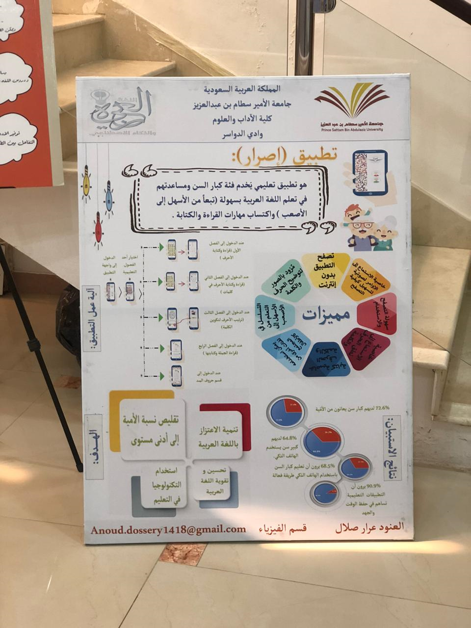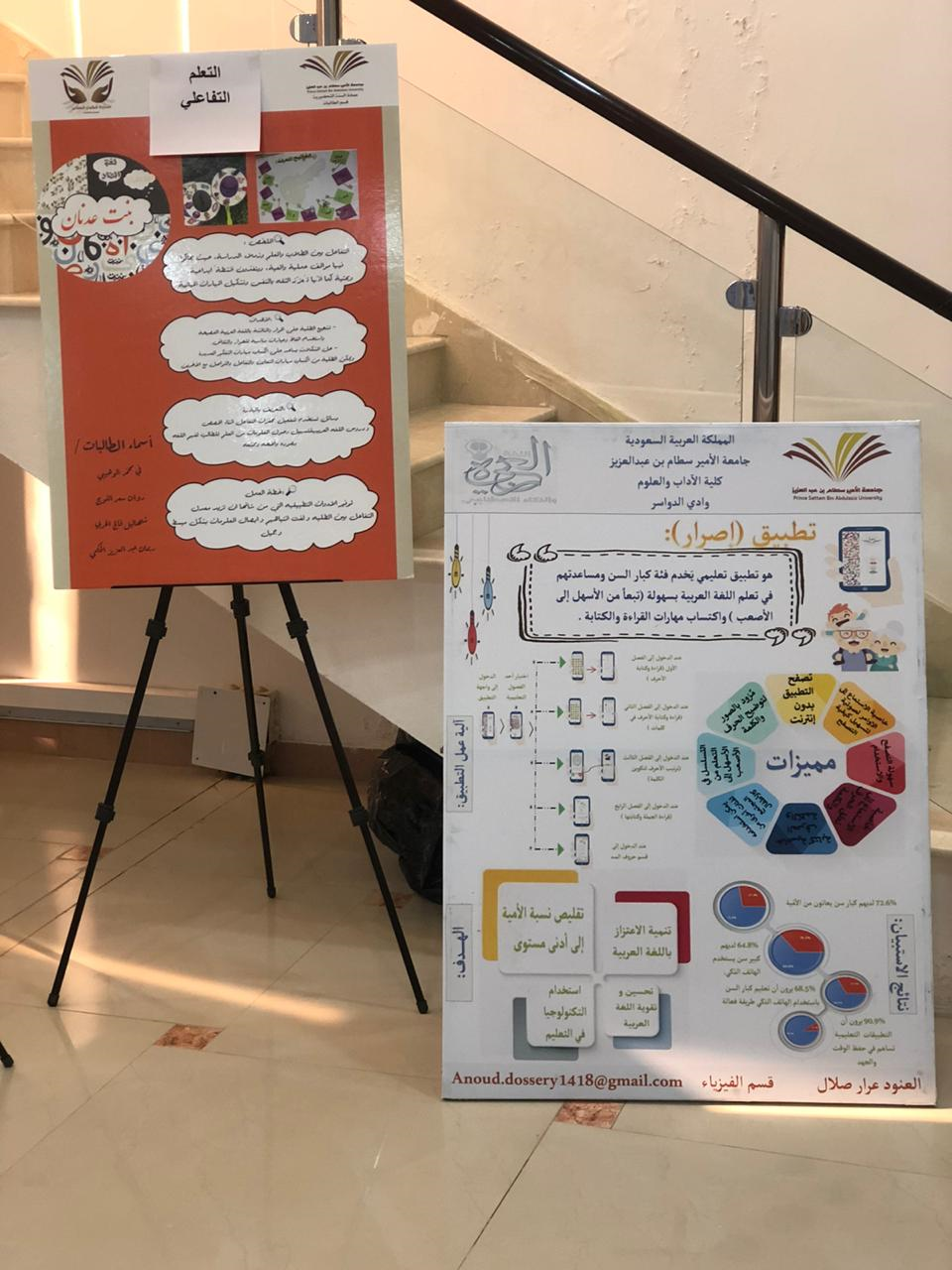 محور الملصقات العلمية: - المركز الأول: رحاب حسن الجريد، من كلية العلوم الطبية التطبيقية. - المركز الثاني: رويدا عبدالعزيز بن زقر، من عمادة السنة التحضيرية. - المركز الثاني مكرّر: سارة سعد المعيذر، وشيماء علي الزهراني، وسديم بندر الشدوخي، وربى خنين الخنين؛ من عمادة السنة التحضيرية. - المركز الثالث: فيّ محـمد الوهيبي، وروان سعد اللويح، وشهاليل فلاح الحربي، وريمان عبدالعزيز الحكمي؛ من عمادة السنة التحضيرية. - المركز الثالث مكرّر: أمجاد العسكر، من كلية الهندسة وعلوم الحاسب. - المركز الرابع: سحر ثاني البقمي، ورزان فلاح العتيبي، وفيّ خالد الزهراني، وشهد أحمد الغامدي، وشموخ علي المطيري؛ من عمادة السنة التحضيرية. والطالبات: غيداء عبدالرحمن عبدالله، ونورة محـمد مبارك، وشيخة فراج مثال، وهوى محـمد جمعان؛ من كلية العلوم والآداب بوادي الدواسر. والطالبات: شهد عبيد البواردي، ورفيف بندر العنزي، وسمر فهد الحربي؛ من كلية المجتمع بالخرج.