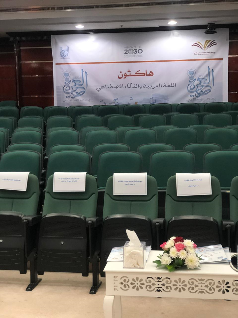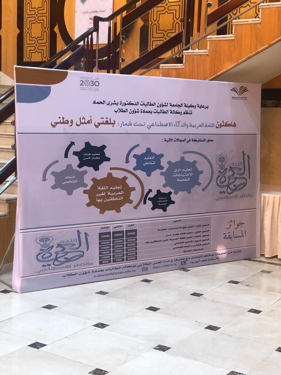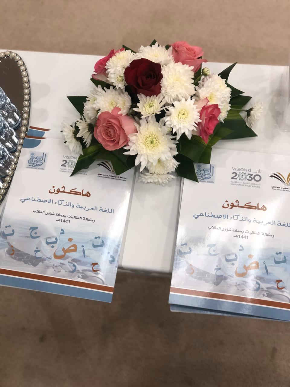 برعاية وكيلة الجامعة لشؤون الطالبات الدكتورة بشرى الحماد أطلقت وكالة الطالبات بعمادة شؤون الطلاب فعاليات هاكثون اللغة العربية والذكاء الاصطناعي، في مسرح مبنى العمادات المساندة، الذي استمرَّ يومي ٩-١٠ جمادى الآخرة ١٤٤١هـ. ففي وسط حضور طلابي بهيج خُصِّص اليوم الأول للتحكيم العلني للمشاركات المنافسة في محاور المسابقة، حيث شُكِّلت لجنة تحكيم معتمَدة من ذوات الاختصاص والخبرة والمسؤولية، نتج عنها ترشيح عدد من المشاركات المتميّزة. وفي اليوم التالي أعلنت الوكالة عن الفائزات، ونظّمت لهن حفلًا اختتمت به فعاليات الهاكثون، وكُرِّمت الفائزات بمحاور المسابقة، إذ كانت العمادة قد خصَّصت جوائز مالية قيّمة للطالبات الحائزات على المراتب المتقدّمة، في محاور المسابقة على النحو التالي :