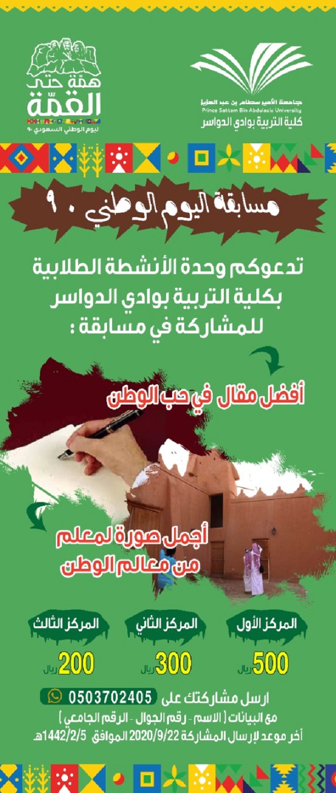 أعلنت كلية التربية بوادي الدواسر ممثلة بوحدة الأنشطة الطلابية عن إطلاق مسابقة لأفضل مقال في حب الوطن وأجمل صورة لمعلم من معالم الوطن ( للطلاب ) بمناسبة احتفال المملكة باليوم الوطني الـ 90 .