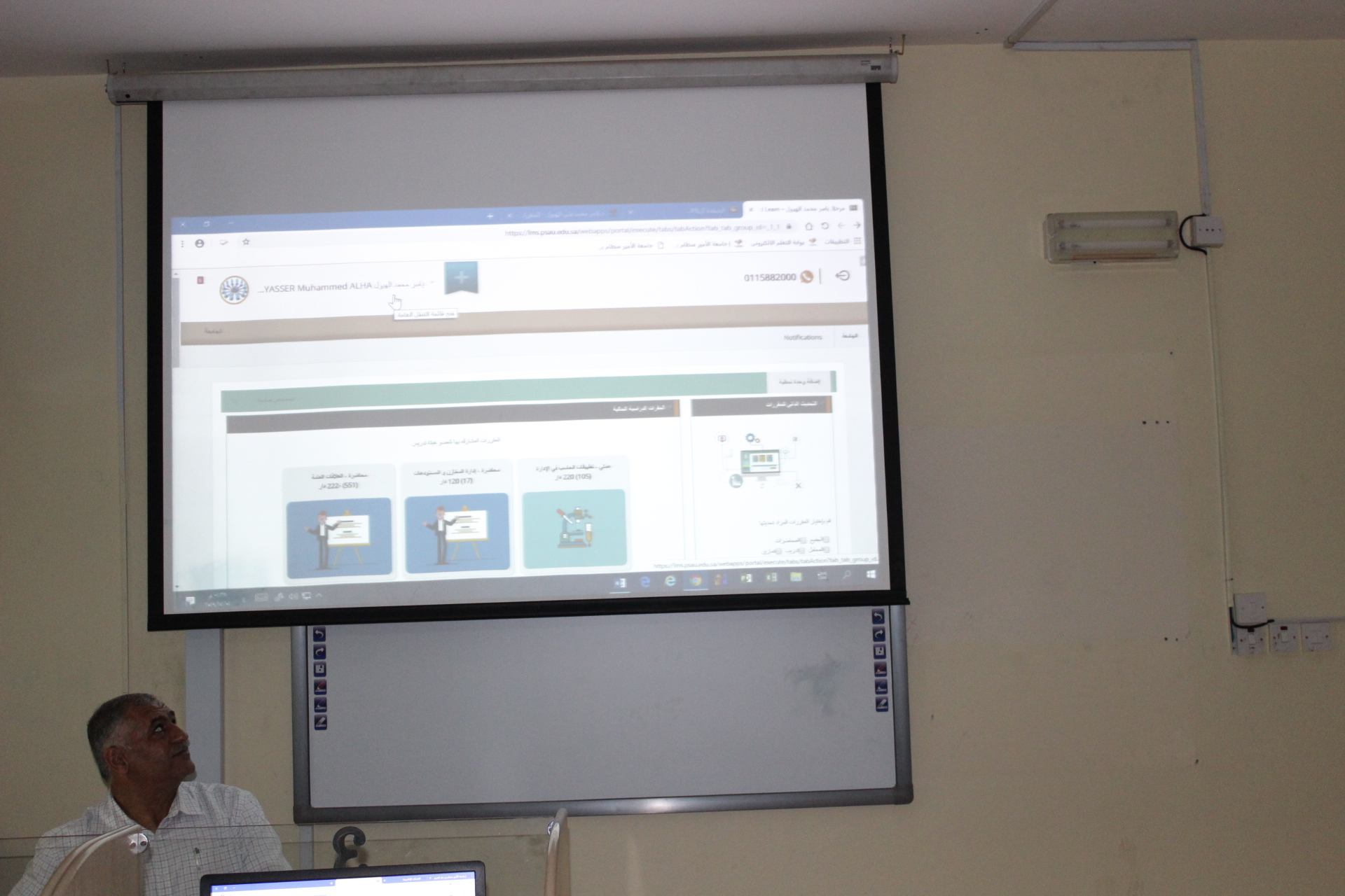 وانطلاقًامن ذلك نظمت وحدة التعلم الإلكتروني بالكلية ورشة عمل لأعضاء هيئة التدريس بعنوان" أساسيات التعامل مع نظام البلاك بورد" استمرت لمدة أربعة أيام بدأت من يوم الأثنين الموافق 8/5/1440هـ حتى يوم الخميس الموافق 11/5/1440هـ وقدم هذه الورشة الدكتور/ ياسر الهبول الأستاذ المساعد بقسم إدارة الأعمال بالكلية والمدرب المعتمد من الجامعة وقد تناولت الورشة عدة موضوعات من أهمها التعريف بصفحة المحتوى والتي تتضمن كيفية إنشاء عنصر أو ملف أو رفع صورة او فيديو تعليمي أو عمل ارتباط ويويب أو أخذ مقطع من You Tube. بالإضافة إلى كيفية إنشاء واجبات للطلاب والتعرف على طريقة تصحيحها. وكذلك تناولت الورشة التعرف على إعداد الاختبارات على نظام البلاك بورد وطريقة تصحيحها.كما تم التعرف أيضا على إنشاء منتدى تفاعلي بين أستاذ المقرر والطلاب بحيث يمكن للطلاب من خلاله الاستفسار عن كل ما يتعلق بالمقرر من خلال هذا المنتدى. كما تطرقت الورشة إلى كيفية استخدام الهواتف الذكية في التعلم الإلكتروني من خلال استخدام تطبيق البلاك بورد المتاح على هذه الهواتف لتشجيع أعضاء هيئة التدريس والطلاب على استخدام التعلم الإلكتروني. وبالإضافة إلى ذلك تناولت المحاضرة كيفية بناء الغرف الافتراضية وطريقة التواصل بين أستاذ المقرر والطلاب من خلال هذه الغرف.