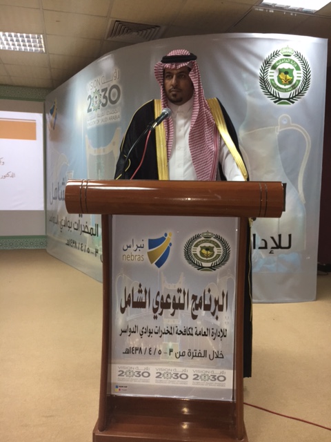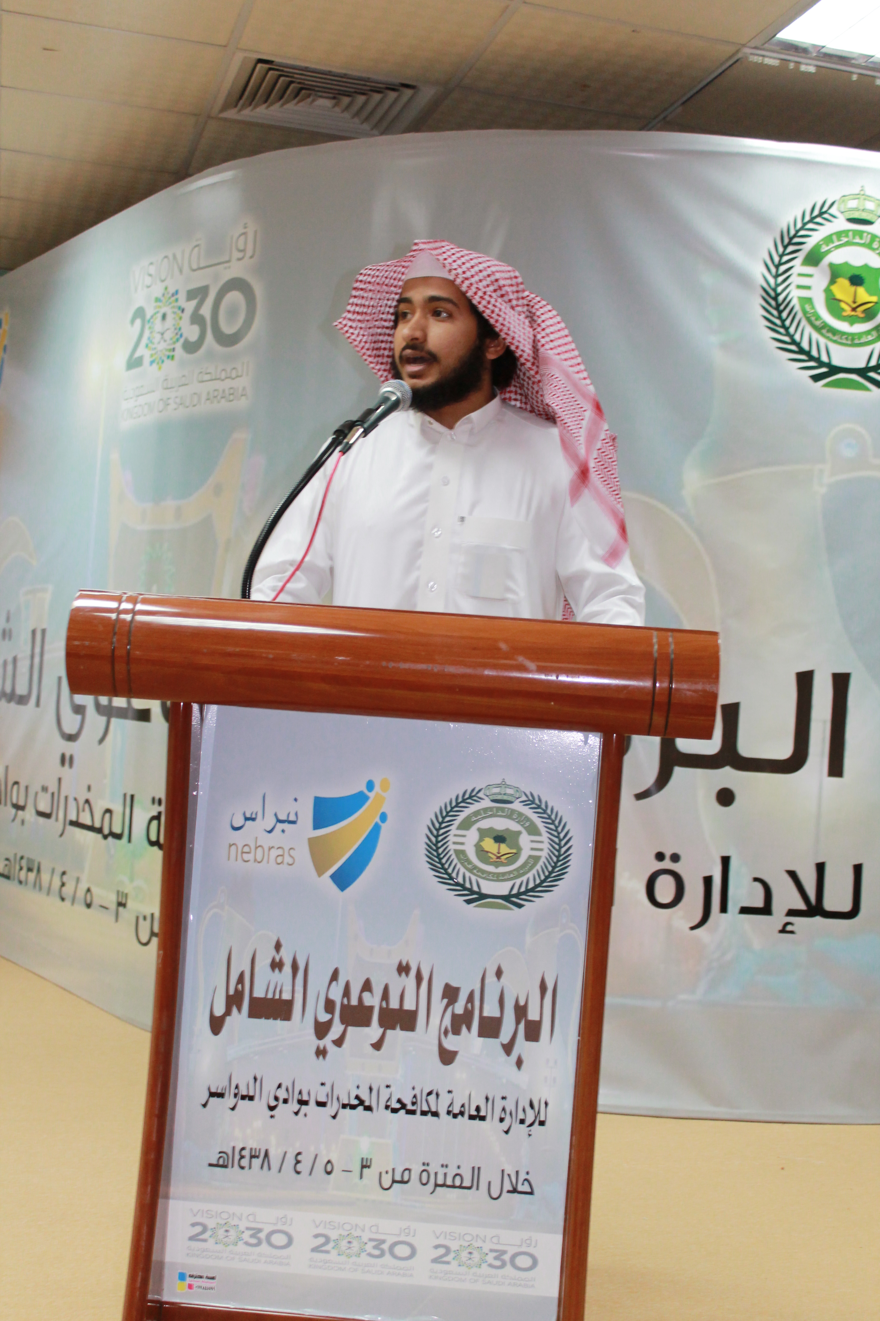 فيما بين مدير إدارة مكافحة المخدرات بوادي الدواسر العقيد ناصر بن هاجد العتيبي أن البرنامج يستهدف جميع فئات المجتمع من خلال المدارس والكليات والمساجد ، وانه سيتم نقل المعرض التوعوي لأماكن تواجد المستهدفين طيلة ايام البرنامج ، مقدماً الشكر لمدير مكافحة المخدرات بمنطقة الرياض اللواء الدكتور عبدالله بن علي الطيار على موافقته بإقامة هذا البرنامج بالمحافظة .
