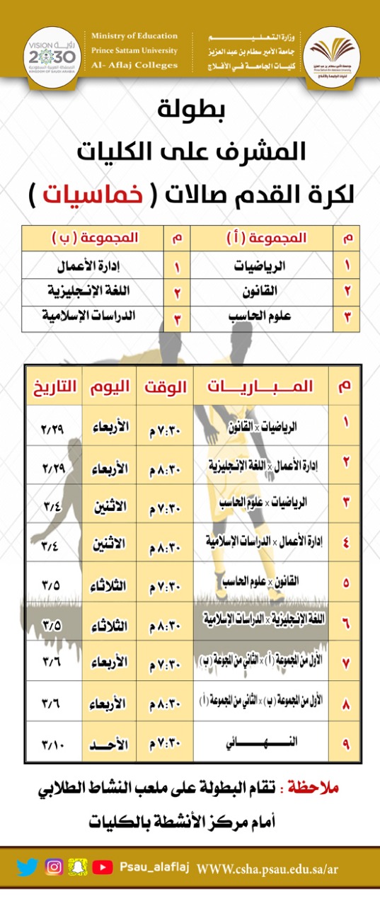 إنطلقت يوم الأربعاء 1440/3/29 هـ بطولة كأس مشرف كليات الأفلاج لكرة القدم (خماسيات) بين الأقسام الأكاديمية بحضور وكيل كلية المجتمع للشؤون التعليمية والأكاديمية الدكتور: لفاي السلمي، والتي يشارك بها 6 أقسام من كليات الأفلاج، وبدأت البطولة بمواجهة ساخنة بين فريق قسم الرياضيات وفريق قسم القانون بملعب مركز الأنشطة الطلابية انتهت بفوز قسم الرياضيات بتسعة أهداف مقابل ثمانية.