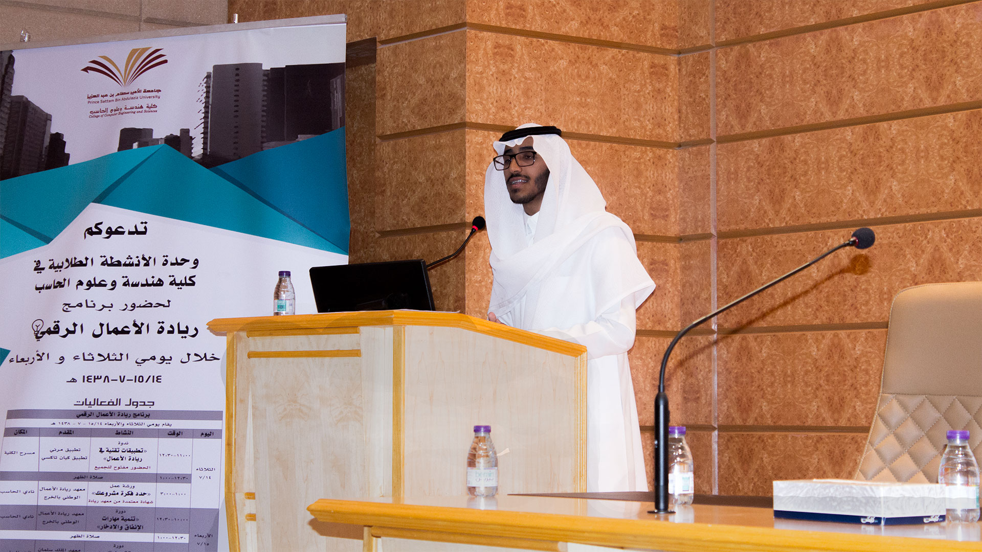 انطلقت فعاليات برنامج ريادة الأعمال الرقمي يوم الثلاثاء الموافق ١٤/٧/١٤٣٨هـ والذي تنظمه وحدة الأنشطة الطلابية بكلية هندسة وعلوم الحاسب بندوة بعنوان (تطبيقات تقنية في ريادة الأعمال) والذي ألقاها المدير التنفيذي ومؤسس تطبيق كيان تاكسي الأستاذ بدر الجعيثن متحدثاً عن مشروعه الريادي و استعراض بعض المعوقات التي واجهها تطبيق كيان في بداياته وكيف تم التغلب عليها.