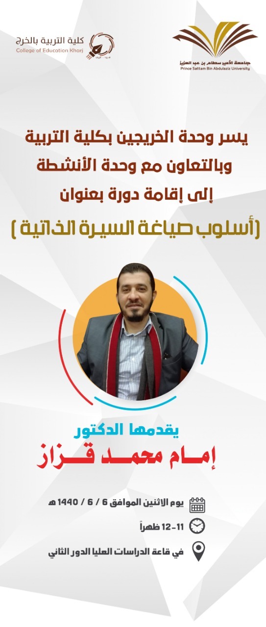 أقامت وحدة الخريجين بالتعاون مع وحدة الأنشطة بكلية التربية بالخرج دورة بعنوان ( أسلوب صياغة السيرة الذاتية ) والتي ألقاها الدكتور إمام محمد قزاز يوم الأثنين بتاريخ 1440/6/6هـ