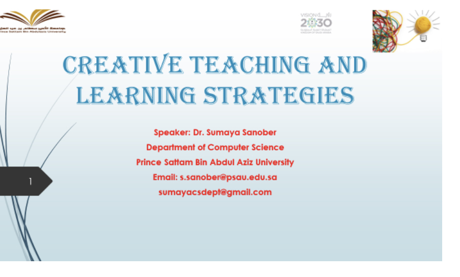 أقامت وحدة التطوير والتميز بقسم علوم الحاسب بكلية الآداب والعلوم بوادي الدواسر ، دورة تدريبية حول استراتيجيات التدريس والتعلم الإبداعي "استراتيجيات التدريس والتعلم الإبداعي" ، وذلك يوم الأحد الموافق 27/3/2022 (26/7). / 1443 هـ) للدكتورة سمية سانوبر المحاضر بقسم علوم الحاسبات وبدأت الورشة الساعة 9:30 صباحا بمبنى الكلية.