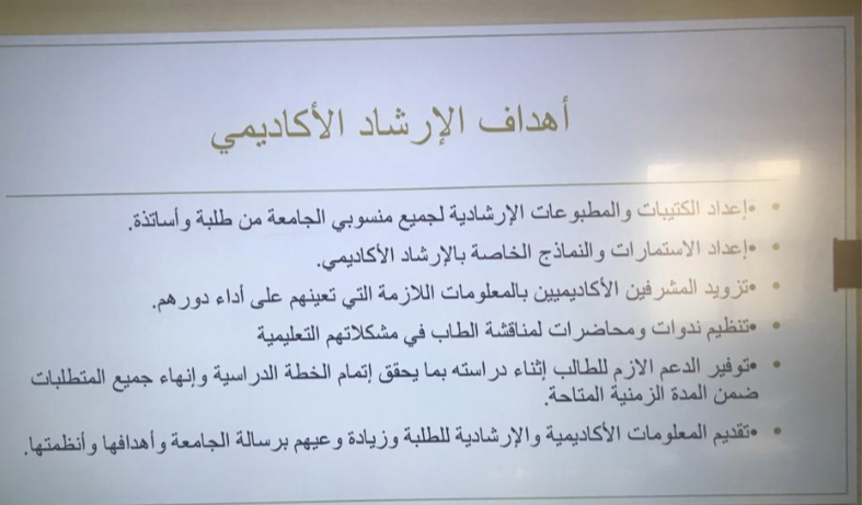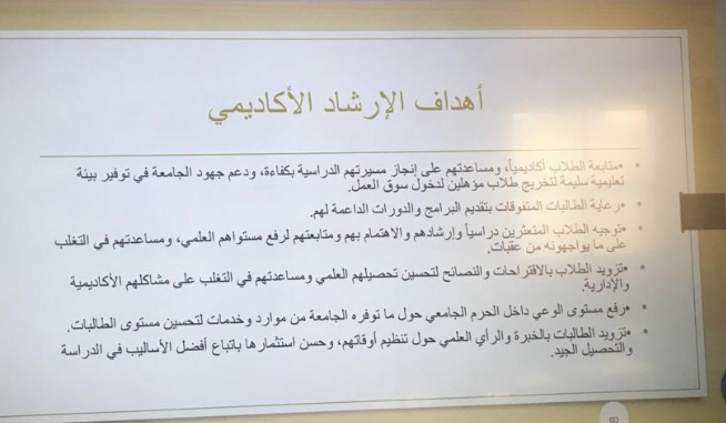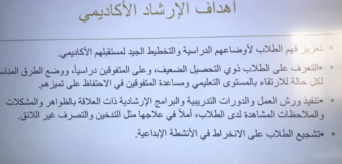 1- التعرف على أهداف الارشاد الأكاديمي 2- تحديد اثر الارشاد الاكاديمي على الطالبة 3- التعرف على مهام المرشد الاكاديمي