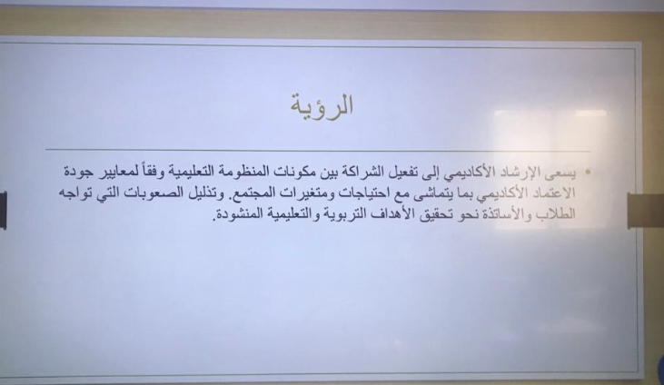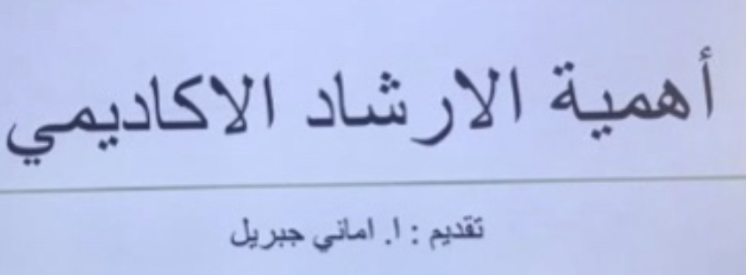 بعنوان " أهمية الارشاد الاكاديمي " اعداد و تقديم الأستاذة أماني جبريل محاضر بقسم الفيزياء وتحت إشراف الدكتورة راضية مداني منديل مشرفة وحدة الإرشاد الأكاديمي بكلية الاداب والعلوم