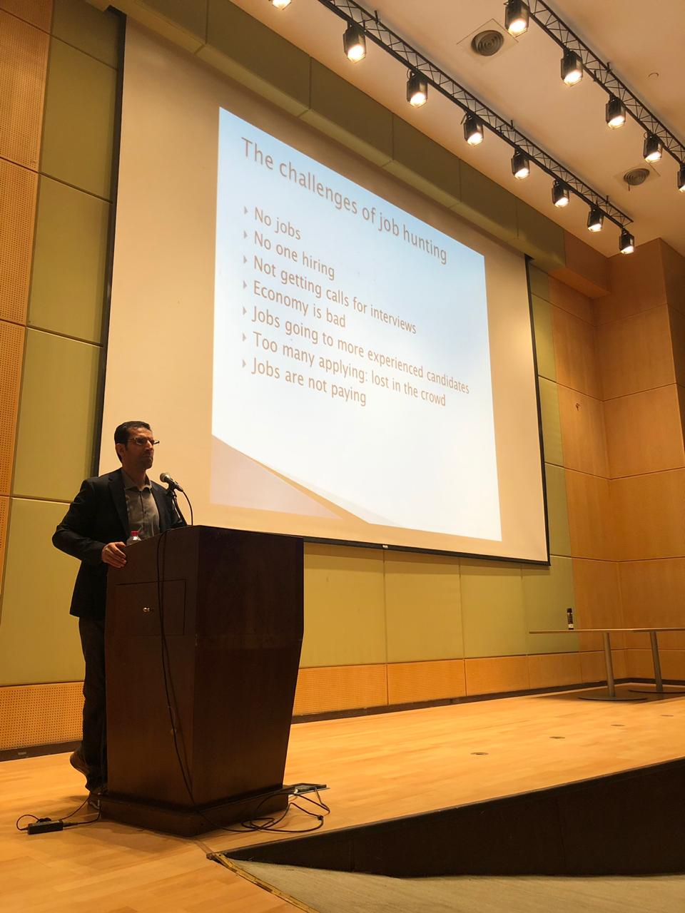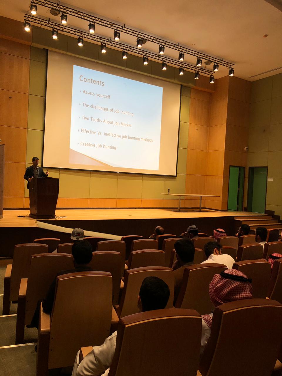 تحت رعاية سعادة الدكتور عبدالرحمن الحارثي – عميد كلية العلوم و الدراسات الإنسانية بالخرج ، وسعادة الدكتور هارون ناصر آل صقر وكيل الكلية للشئون التعليمية والأكاديمية – وفي إطار رفع وعى الطلاب المتوقع تخرجهم عن سوق العمل وصعوبات الحصول على فرص عمل ، أقامت لجنة الخريجين بالكلية دورة بعنوان اقتناص فرص العمل وذلك يوم الثلاثاء الموافق 29/1/2019م ( 23/5/1440هـ) بمسرح الكلية ،حيث كان محاضر الدورة سعادة الدكتور أحمد عمارة الأستاذ المساعد بقسم اللغة الإنجليزية بالكلية، وقد ناقش سعادة العديد من النقاط الهامة والمتعلقة بموضوع الدورة والتي تساعد الطالب بعد التخرج على اقتناص فرصة العمل . فقد تفضل سيادته بتعريف وتصنيف الطرق المتبعة في اقتناص فرص العمل ، حيث صنفها بالطرق التقليدية والطرق الذكية ، وعرض بالأرقام والإحصائيات فرص كل طريقة في اقتناص فرصة العمل. كما تناول بعض الصعوبات والتحديات التي تواجه الخريج في الحصول على فرص العمل. وفي ختام الدورة توجه سعادة الدكتور محمد المرسي – الأستاذ المساعد بقسم الفيزياء ومشرف لجنة الخريجين بالقسم- وسعادة الدكتور راشد خليفة - الأستاذ المساعد بقسم اللغة الإنجليزية والمشرف العام على النشاط الطلابي بالكلية - بالشكر الجزيل لسعادة الدكتور أحمد عمارة على جهده في الدورة وهو جهد يذكر فيشكر.
