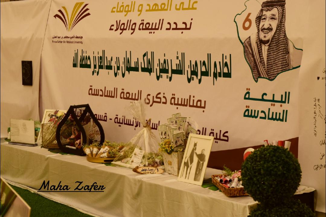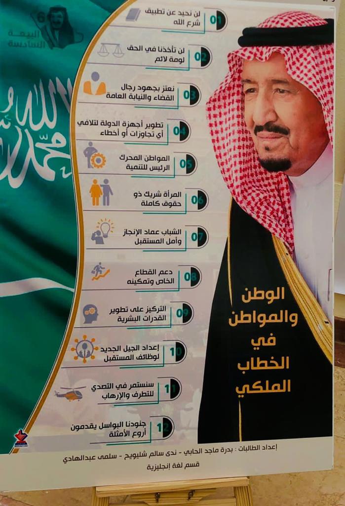 احتفاءً بذكرى البيعة السادسة لخادم الحرمين الشرفين الملك سلمان بن عبدالعزيز ، أقامت وحدة النشاط الطلابي بالتعاون مع وحدة شؤون الطالبات في هذا اليوم يوم الاربعاء الموافق 3/4/ 1442 هـ احتفاءً ومعرضاً يجسد عبارات السمع والطاعة وتوثيق الولاء والانتماء وتأكيد البيعة لخادم الحرمين الشرفين الملك سلمان بن عبدالعزيز و ولي عهده صاحب السمو الملكي الأمير محمد بن سلمان حفظهم الله وحفظ الله وطننا من كل سوء ومكروه ،