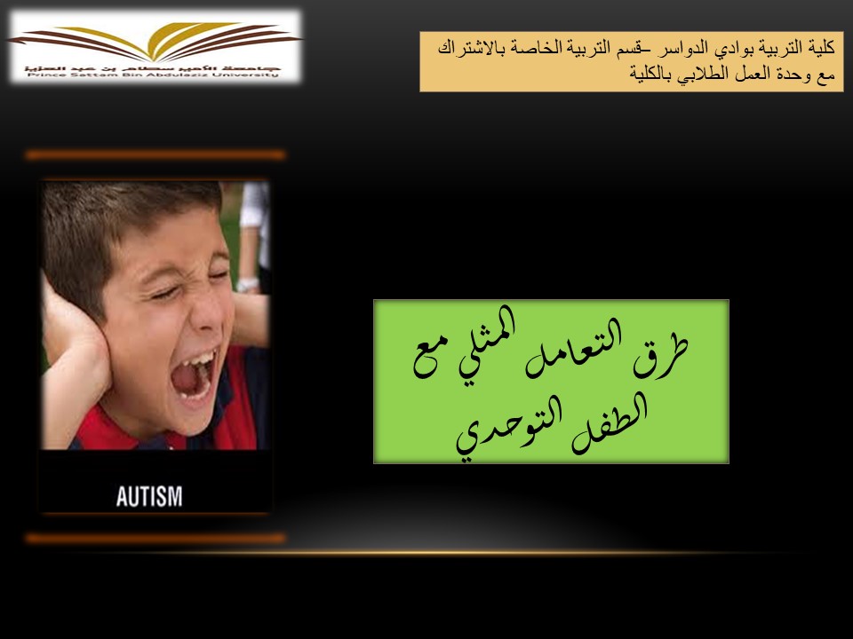 برعاية سعادة عميد الكلية الدكتور/ ماجد على آل شريدة، أقامت وحدة العمل الطلابي بكلية التربية بوادي الدواسر بإشراف د/ مروة أبوالفضل . دورة تدريبية بعنوان (طرق التعامل المثلى مع الطفل التوحدي ) وذلك يوم الخميس الموافق 1/4/2021م ، تقديم سعادة الدكتورة/ مرفت عزمي عبدالجواد – أستاذ التربية الخاصة المشارك - بالكلية