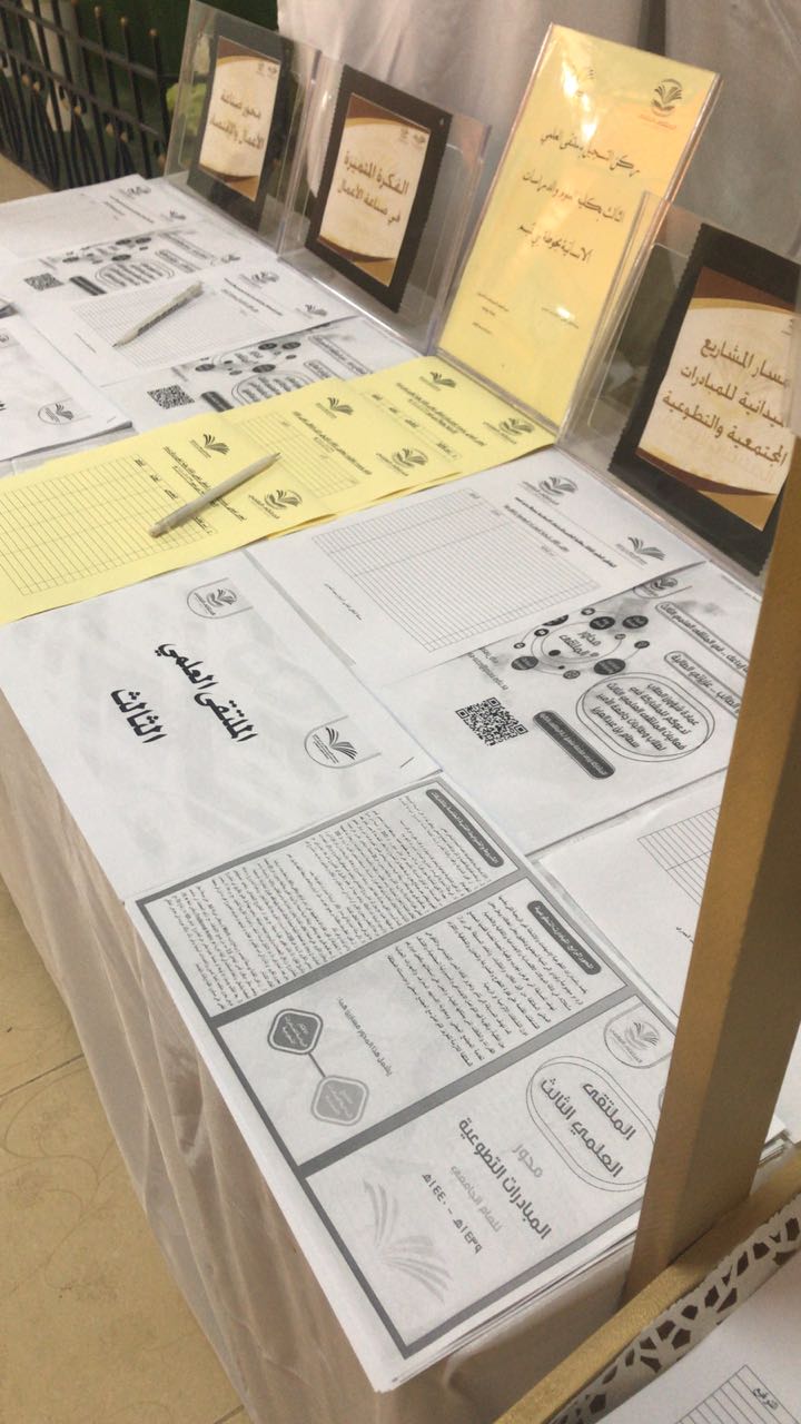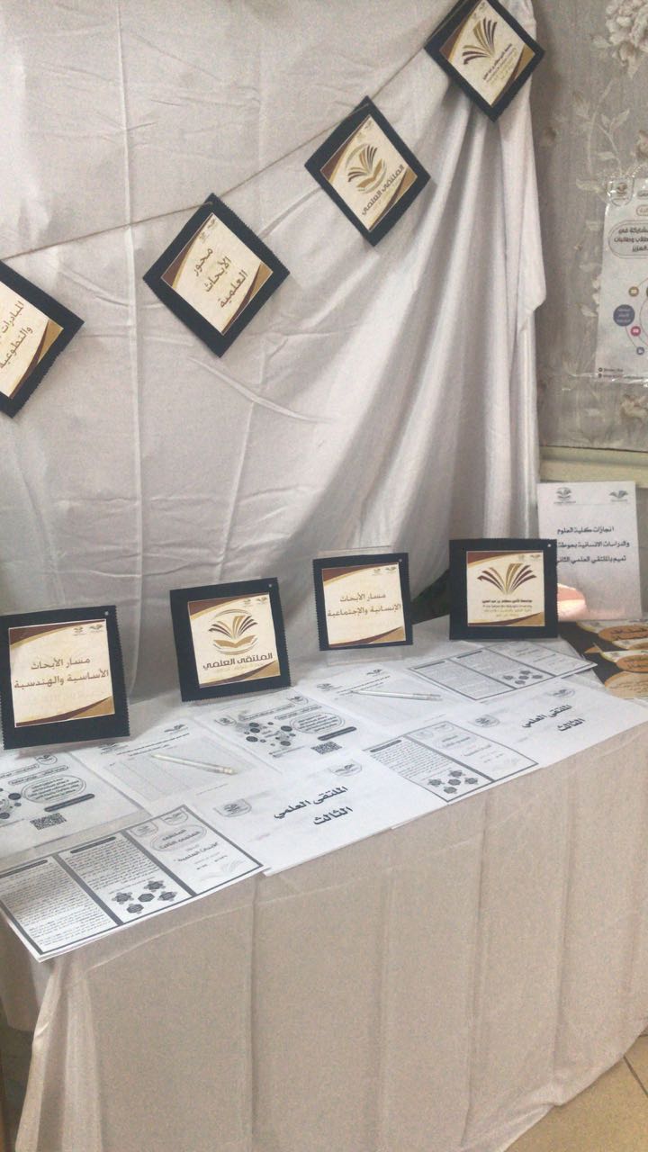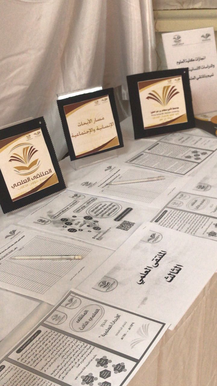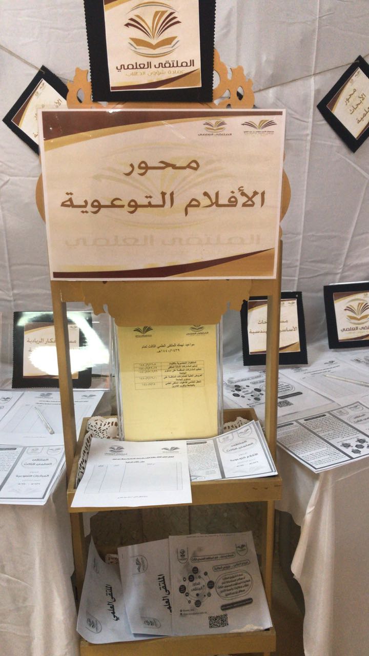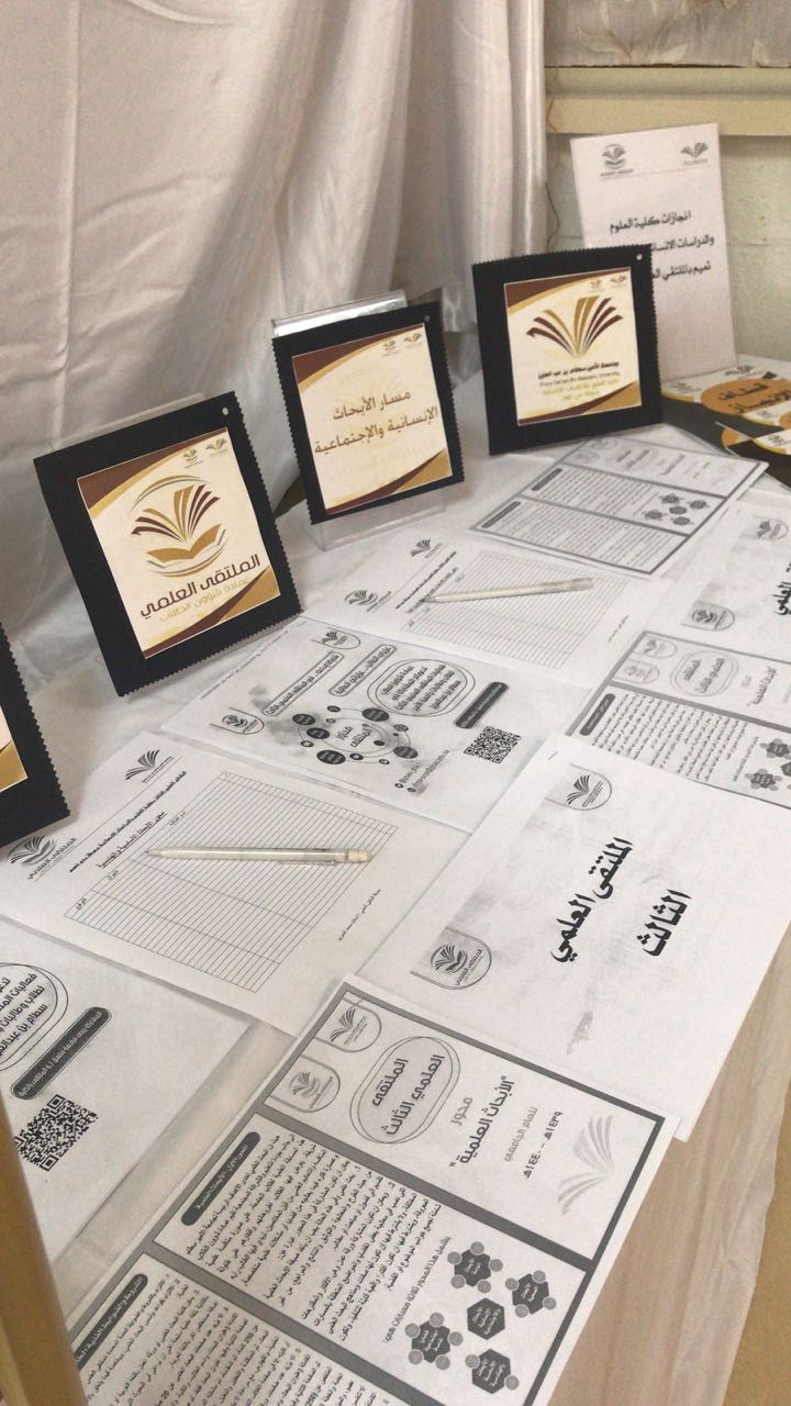 تحت رعاية عميدة كلية العلوم والدراسات الإنسانية بحوطة بني تميم الدكتورة حصة الهزاني وبإعداد منسقة الملتقى العلمي الثالث ا.اسلام العمري واللجنة التنظيمية للملتقى، تم تنظيم أركان تعريفية للملتقى العلمي الثالث في صباح يوم الاربعاء الموافق 5/ 4/ 1440 هــ حيث تضمنت الاركان منشورات تعريفية بالملتقى ومحاوره وشروطه وضوابطه لكل محور، وكما تضمن جداول حصر مبدئي لكل محور على حدة.