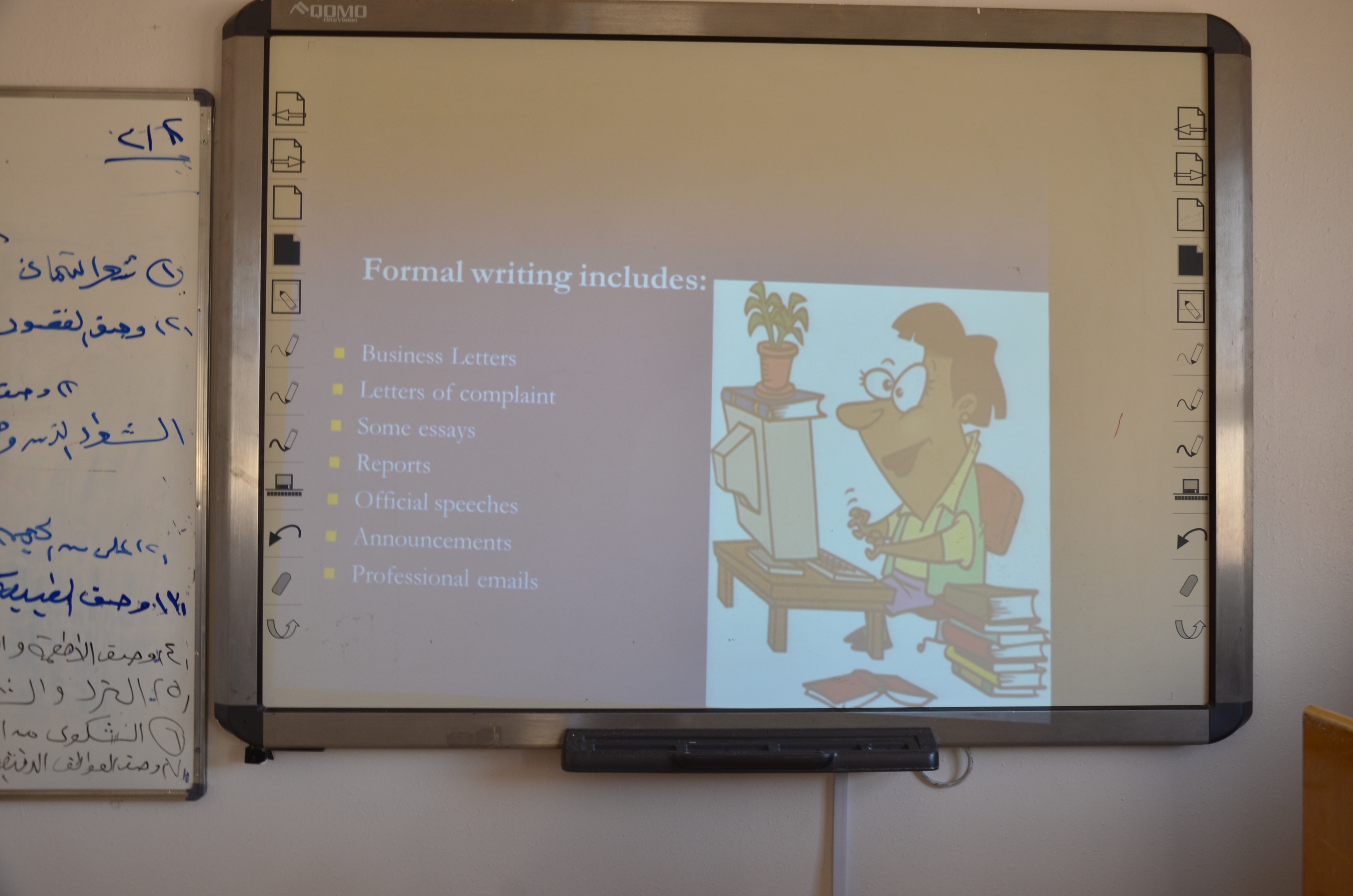 قدمتها عضو هيئة التدريس الدكتورة منال الوكيل ، استهدفت المستويات العليا بقسم اللغة الإنجليزية حيث تهدف الى إلقاء الضوء على أساليب اللغة المستخدمة في المخاطبة و الكتابة الرسمية و غير الرسمية والقواعد التي يجب اتباعها عند استخدام هذه الاساليب .