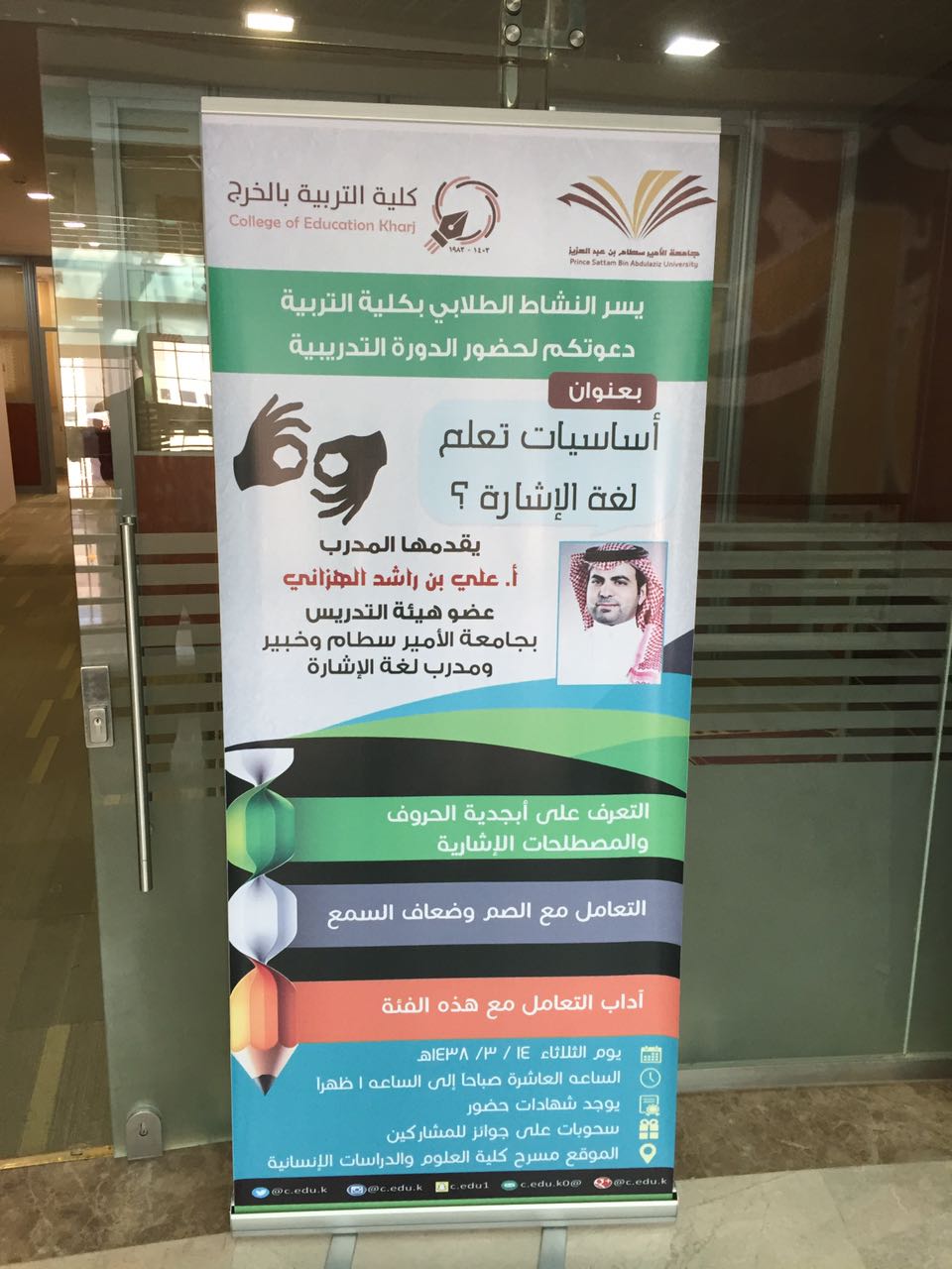 أقام النشاط الطلابي بكلية التربية بالخرج –برعاية عميد الكلية الدكتور عبد الرحمن بن عبيد الرفدي- دورة تدريبيّة في أساسيات تعلم لغة الإشارة قدّمها المدرب أ. علي بن راشد الهزاني عضو هيئة التدريس بالجامعة وخبير ومدرب لغة الإشارة، على مسرح كلية العلوم والدراسات الإنسانيّة اليوم الثلاثاء 14 / 3 / 1438هـ في تمام العاشرة صباحًا.