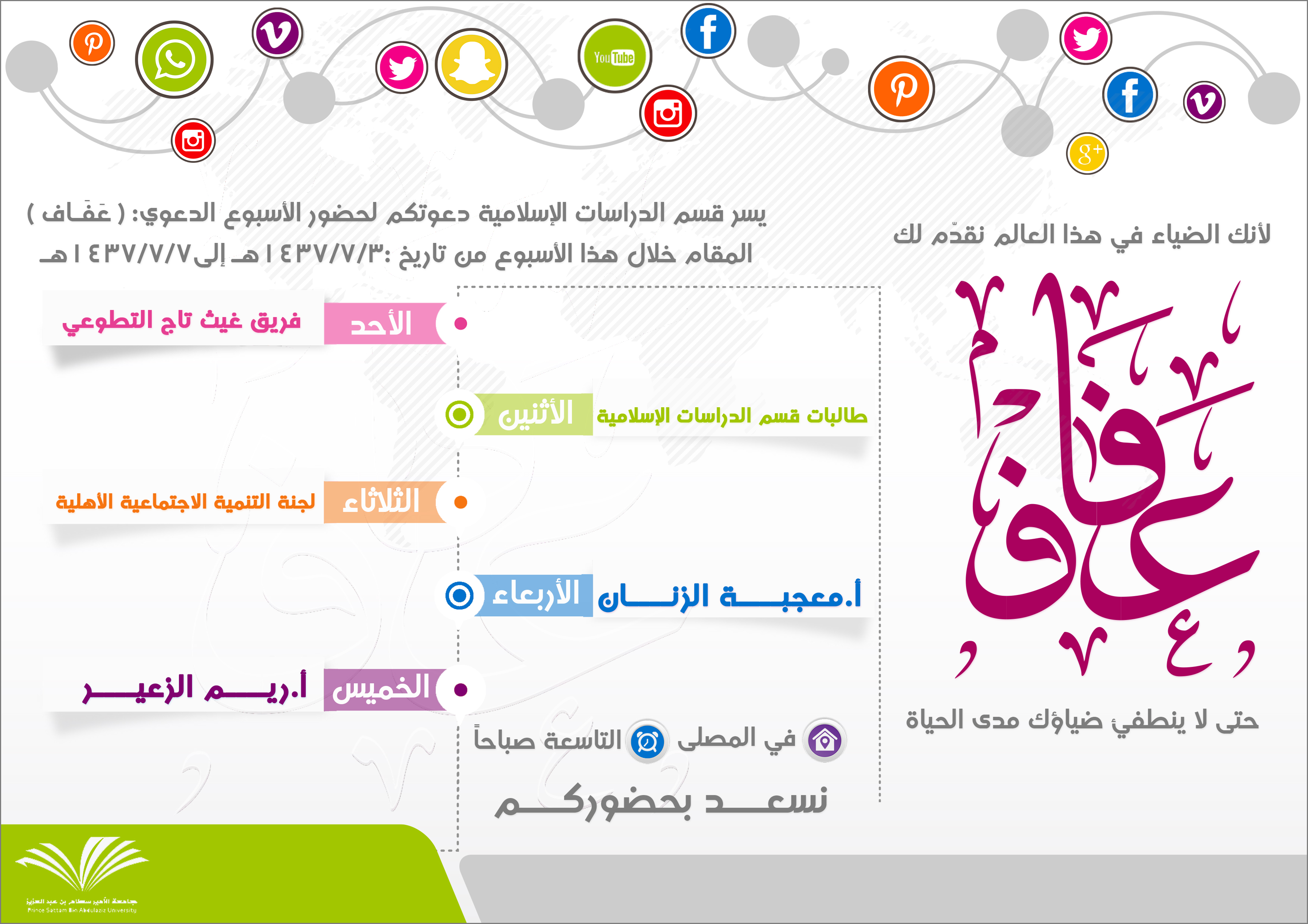 أقام قسم الدراسات الإسلامية بالتعاون مع النشاط الطلابي بكلية العلوم والدراسات الإنسانية بالإفلاج اليوم الأحد 1437/7/3 هـ الساعة التاسعة صباحاً في مصلى الكلية أسبوع دعوي بعنوان ( العفاف ) أعد البرنامج أ.أشواق العاتي بتوجيه من رئيسة القسم د.عزة بلول , قدم البرنامج إحدى الطالبات تحدثت عن الحجاب و قضية التهاون به حيث إنها ليست الإ تنفيذ لمخططات أعدائنا لإبعادنا عن ديننا الإسلامي المحافظ و التدرج في البعد عن الستر , بعد ذلك تم عرض فلم بعنوان ( العفة أسلوب حياة ) تحدث عن العفة و أنواعها وفضل العفة , و ارتباط الحياء بها , كما اورد بعض القصص عنها , استهدف البرنامج جميع شرائح الكلية , حيث يهدف إلى الدعوة للعودة لتمسك بالحجاب وحماية المرأة نفسها .