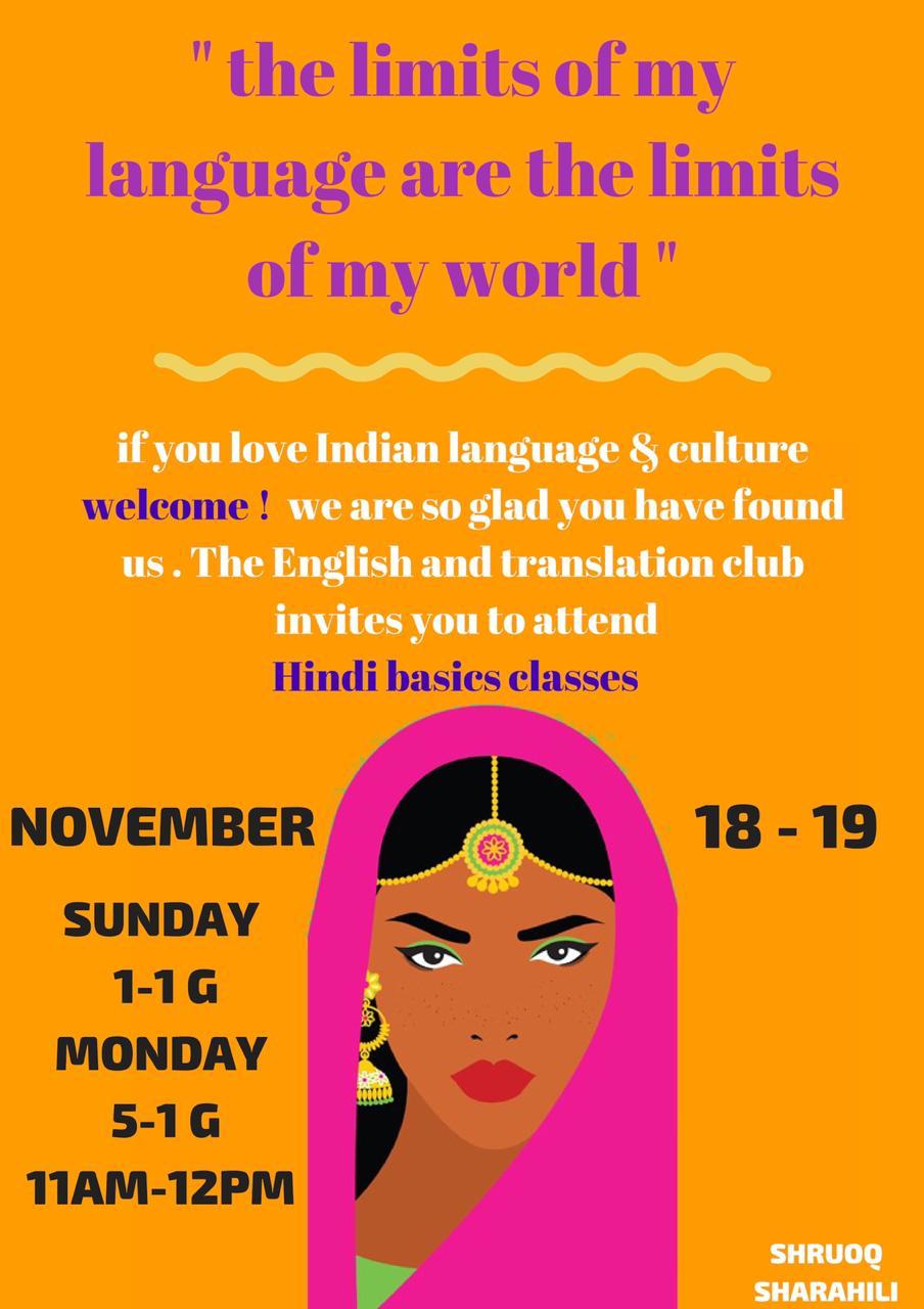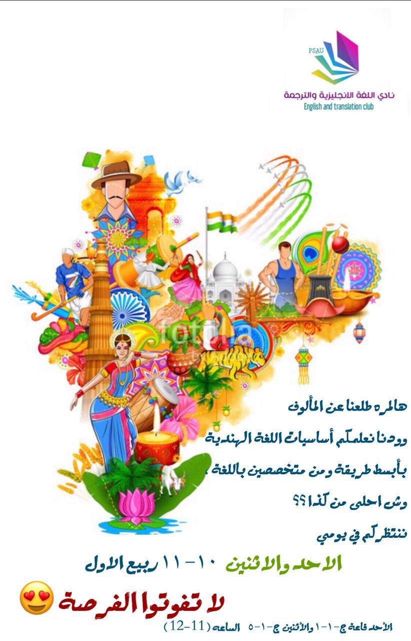 - ففي يوم الأحد والاثنين الموافق 10_11/3/1440هـ نظم النادي دورة قصيرة عن تعلم أسس اللغة الهندية فقد كانت من إلقاء محاضرات القسم من الجنسية الهندية، ولاقت هذه الدورة حضورًا كبيرًا من الطالبات.