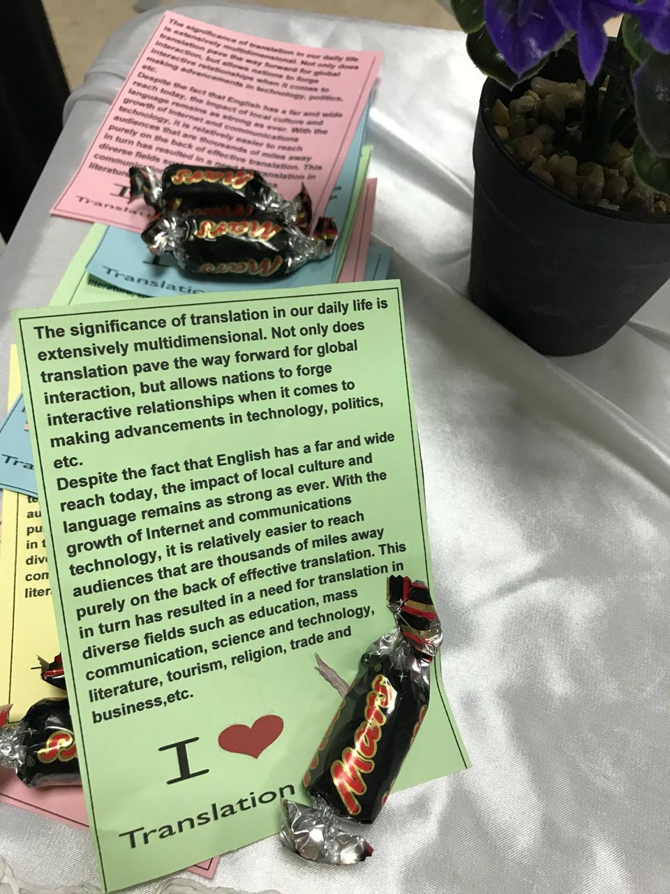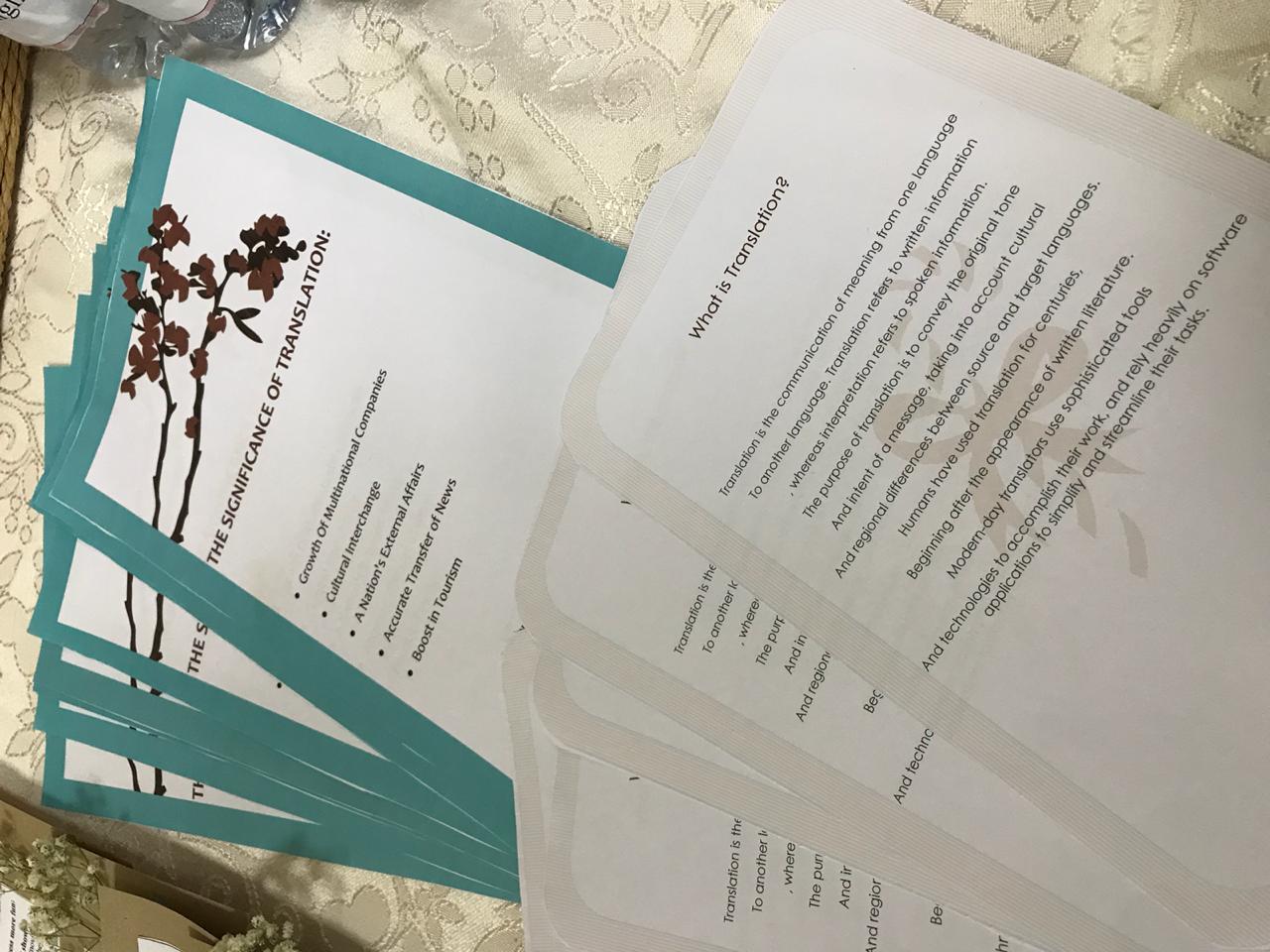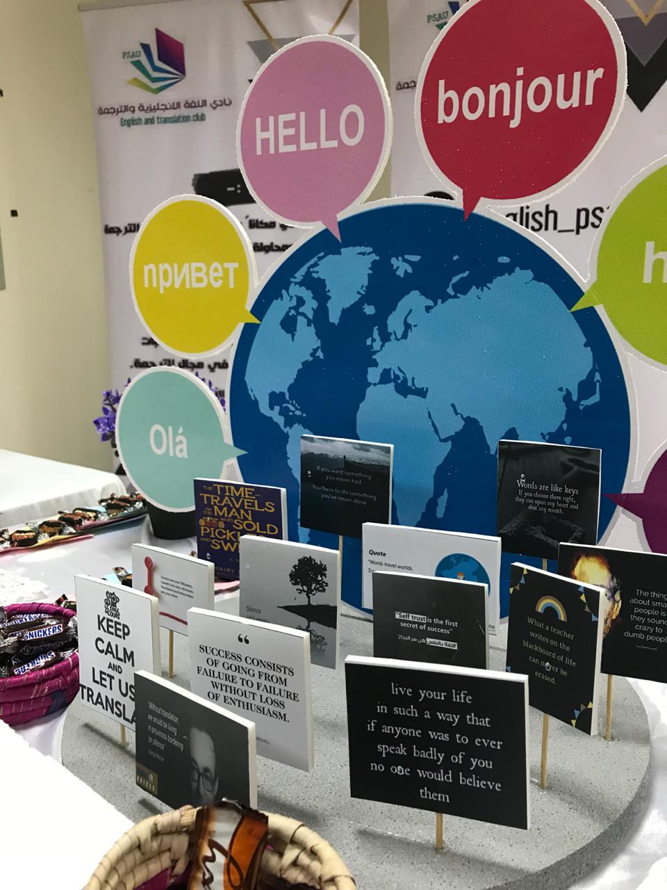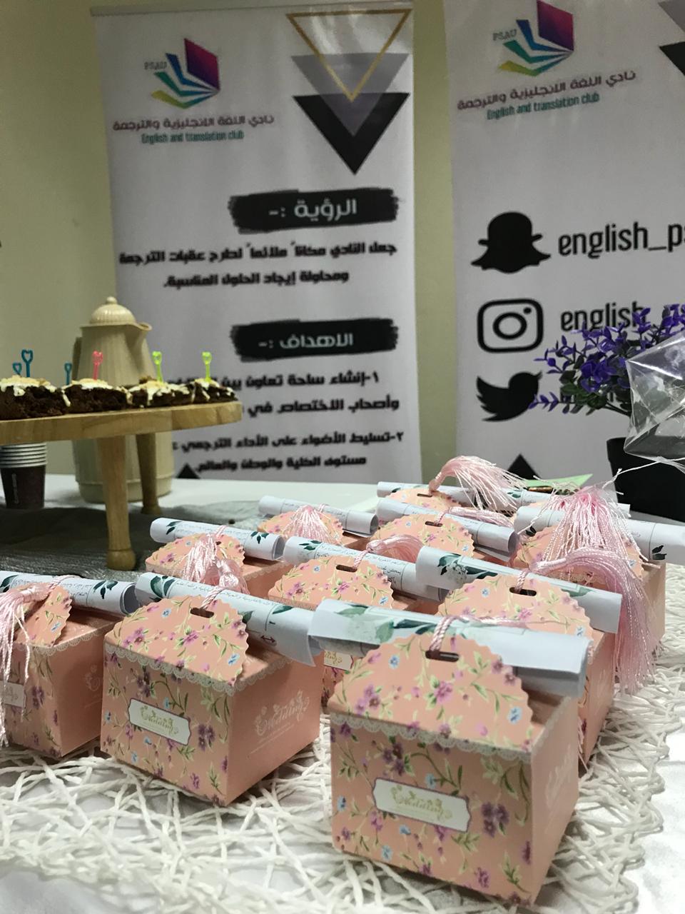 وكذلك أقام قسم اللغة الإنجليزية بالتعاون مع مكتب العمل الطلابي في يوم الأحد الموافق 26/1/1440هـ الاحتفال باليوم العالمي للترجمة في بهو الكلية حيث جاء فيه التعريف بأهمية الترجمة وبعض الإرشادات للترجمة الفعالة وقد كان هناك أيضًا مسابقات حصلن فيها الطالبات الفائزات على اشتراك في معهد كابلي.
