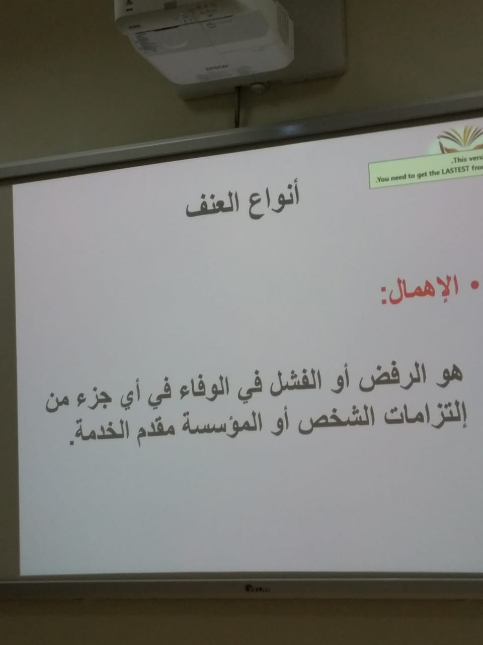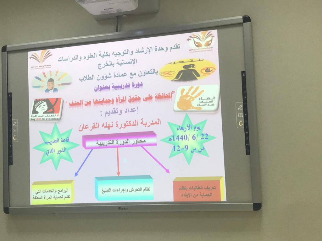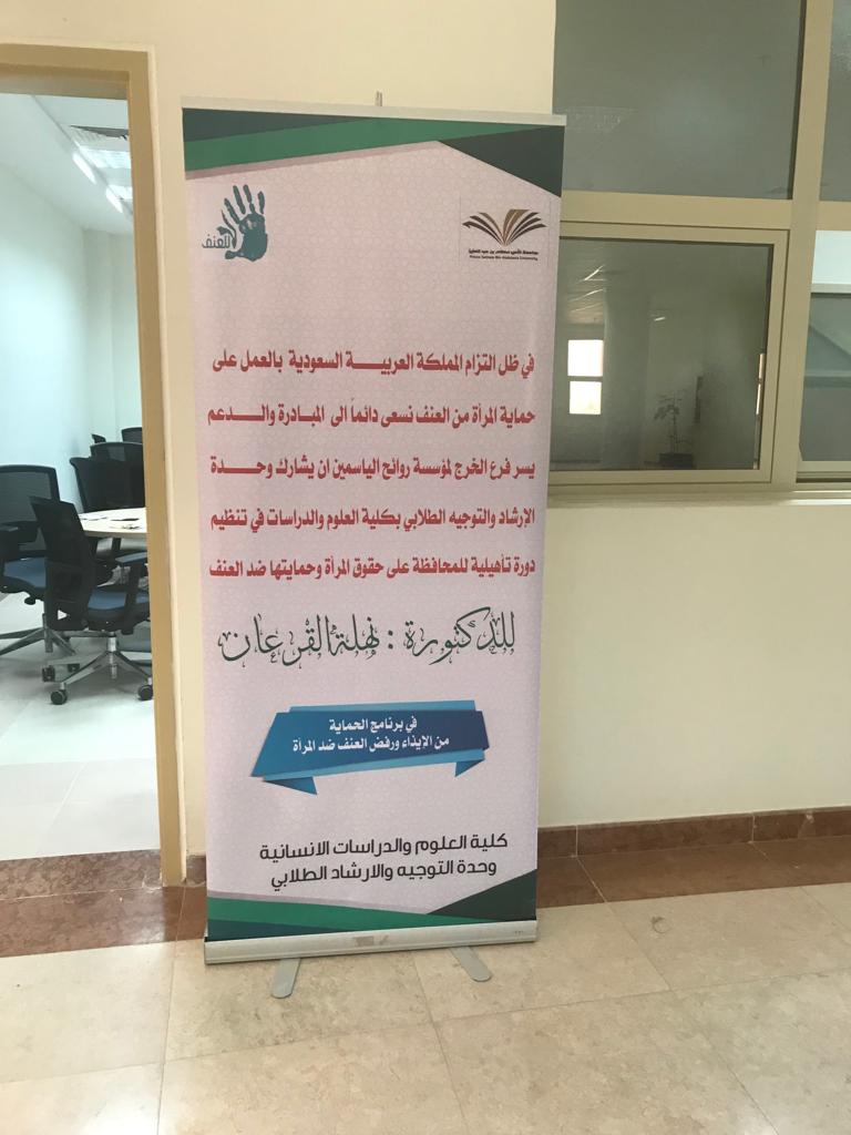 - قد تم في يوم الأربعاء الموافق 22/6/1440هـ تنفيذ الفعالية الثالثة ضمن برنامج الحماية من الإيذاء ورفض العنف ضد المرأة دورة تأهيلية للطالبات بعنوان (المحافظة على حقوق المرأة وحمايتها ضد العنف) من تقديم الدكتورة نهلة القرعان رئيسة وحدة الإرشاد بعمادة شؤون الطلاب بالجامعة حيث كانت الدورة هادفة وشيقة تناولت الدكتورة فيها العديد من المحاور والأهداف المتنوعة.