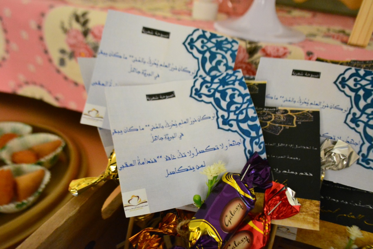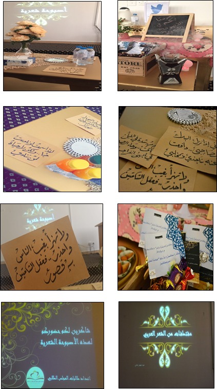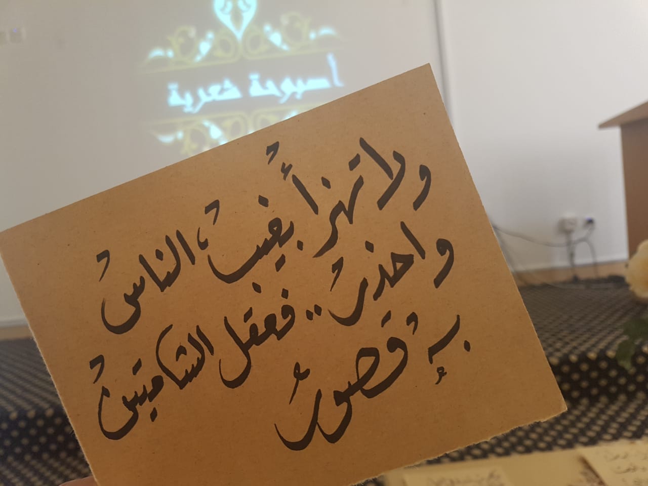 أقام المجلس الاستشاري الطلابي بعمادة السنة التحضيرية /شطر الطالبات يوم الخميس الموافق 1440/5/11هـ اصبوحة شعرية اضفت على ذلك اليوم لمسة شاعرية ممزوجة بروح الإنتماء للوطن الحبيب ولغتنا العربية الفصحى . حيث قام طالبات المجلس بإلقاء قصائد بالفصحى واستعراض بعض القصائد المصورة وكانت تهدف لتعزيز اللغة العربية الفصحى وطرق الإلقاء الجيدة. وقد تم توزيع بطاقات تحمل ابيات شعرية وعبارات تحفيزية . ولاقت الفعالية استحسان الجميع من استاذات وطالبات وابدوا اعجابهم الشديد بها وانها اضفت لهم جو جميل .